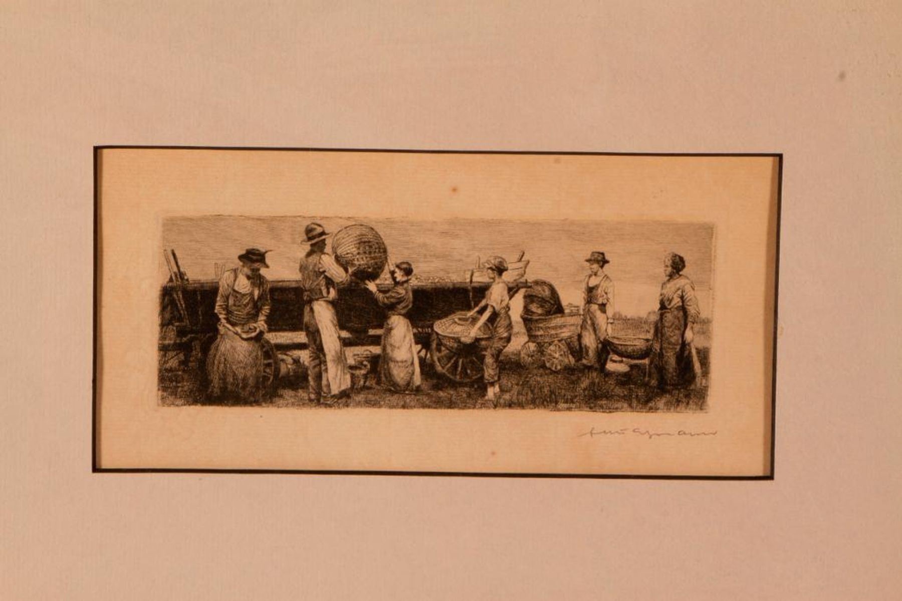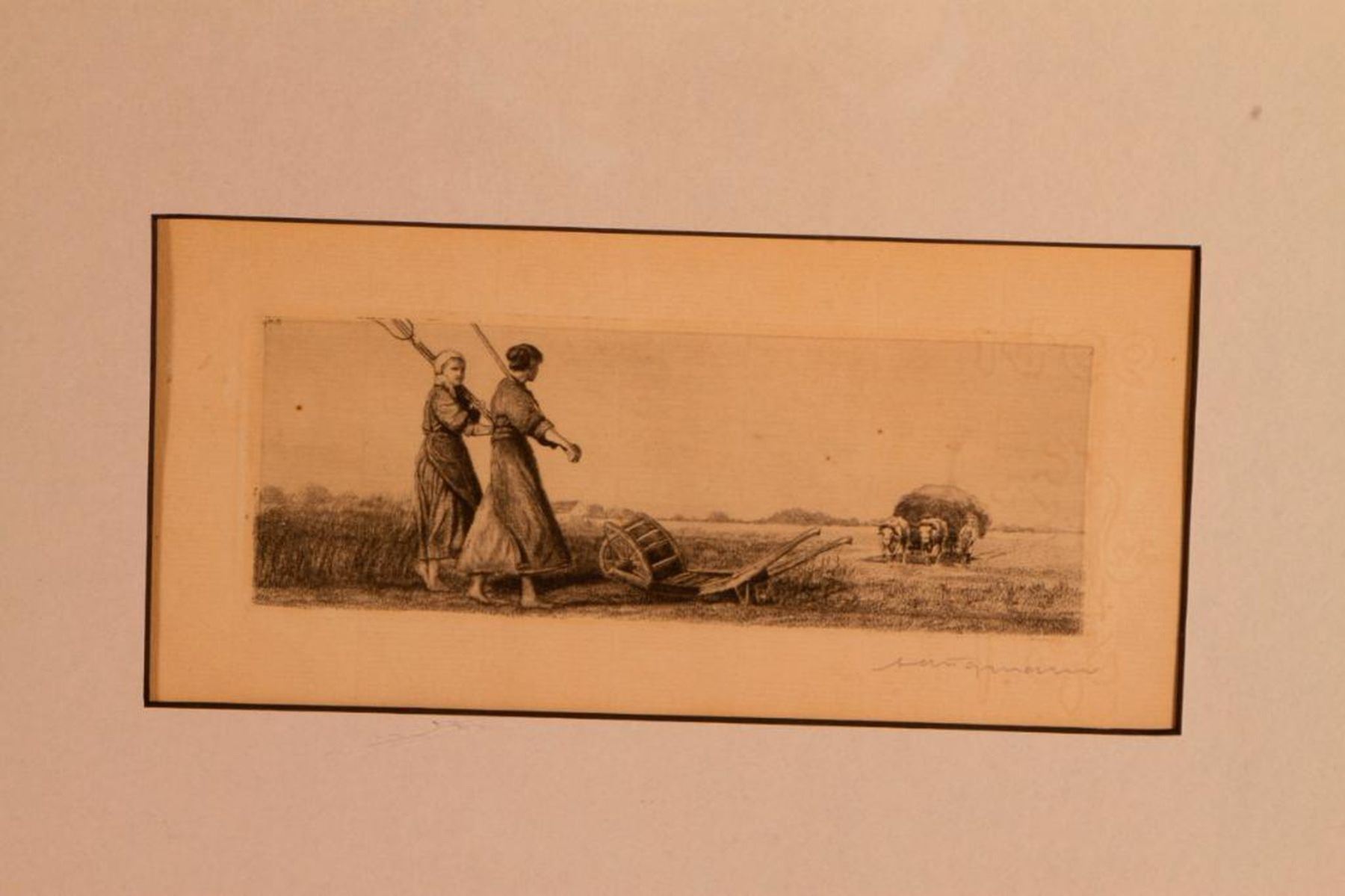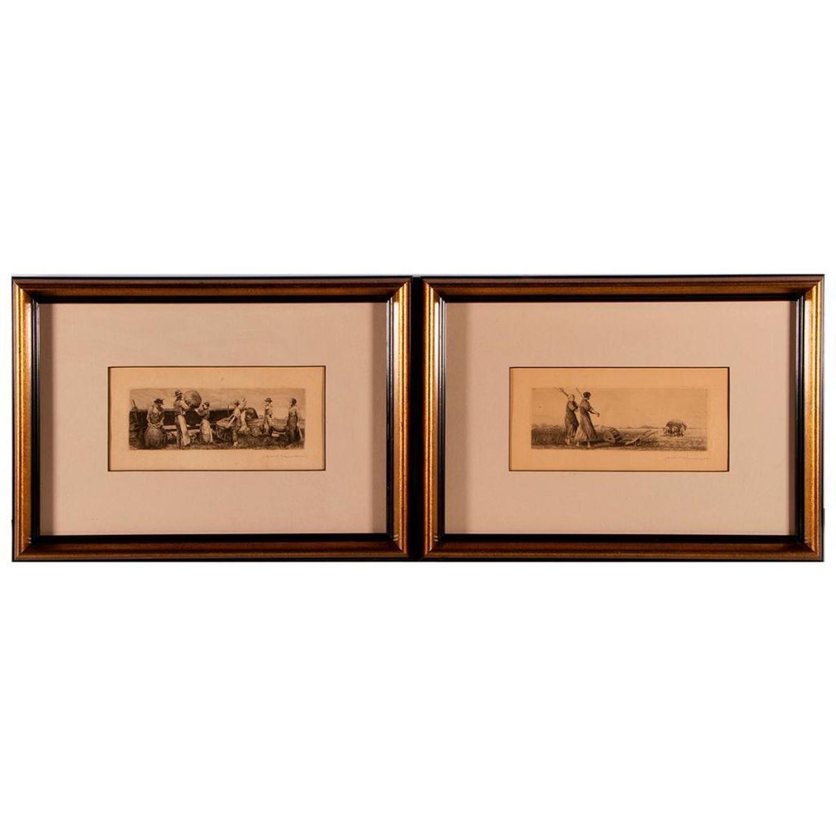 Artist: Illegible. Title/Subject: Harvest scenes. Signature: Lower right. Medium: Etchings. Size frame: 10 1/4" H x 14 1/4" W. Size image: 3 1/2 " H x 7 3/4" W. Created: 19th century. Condition: Good.