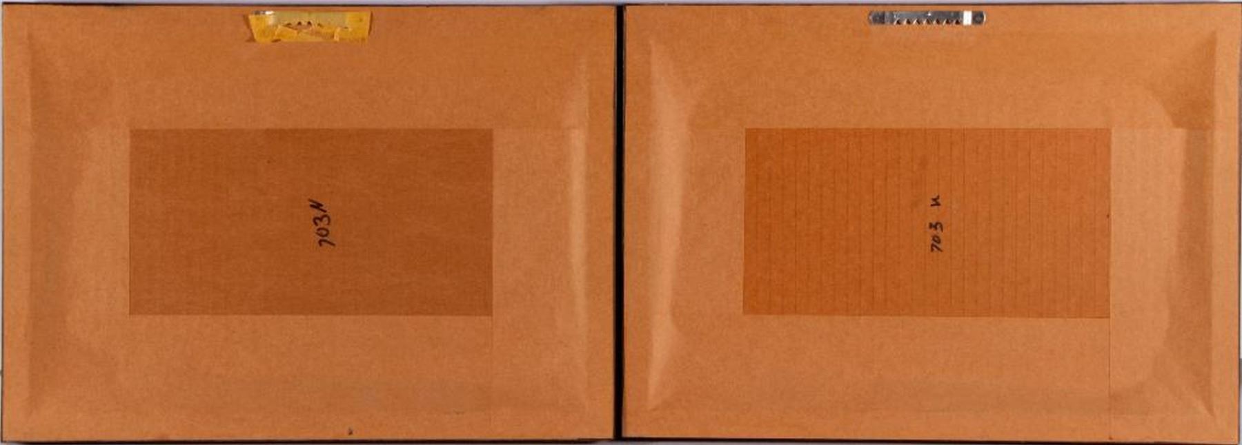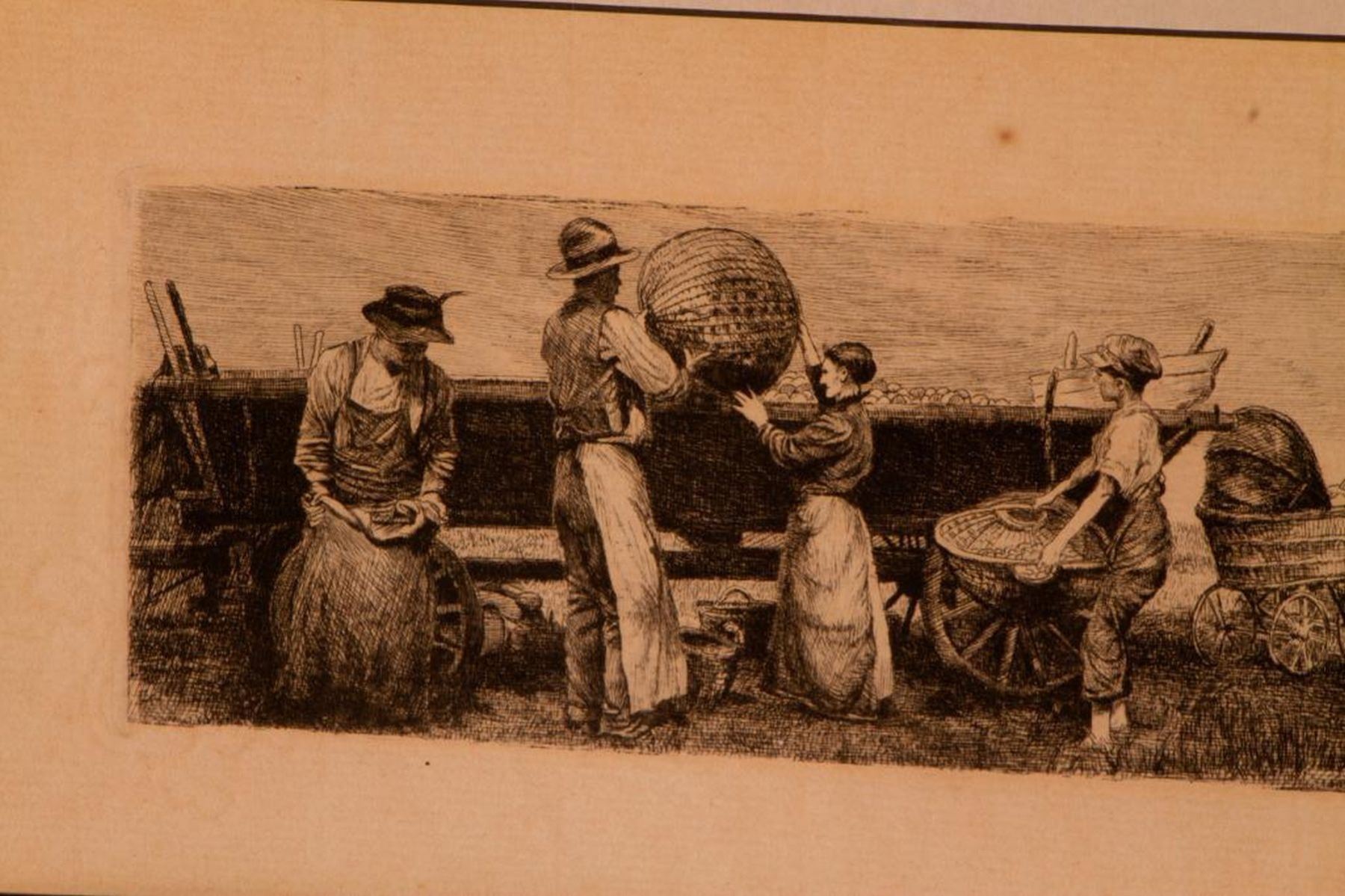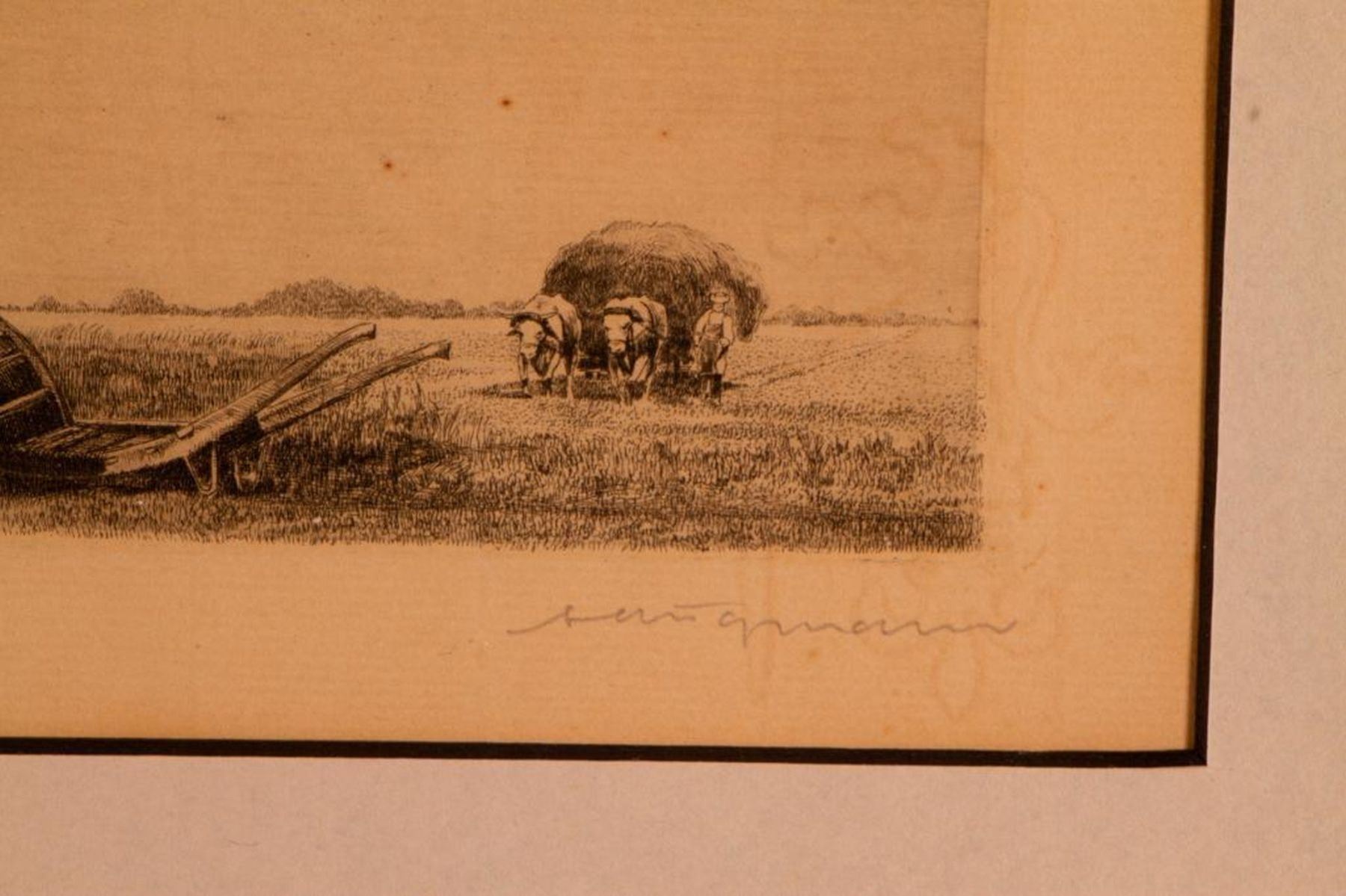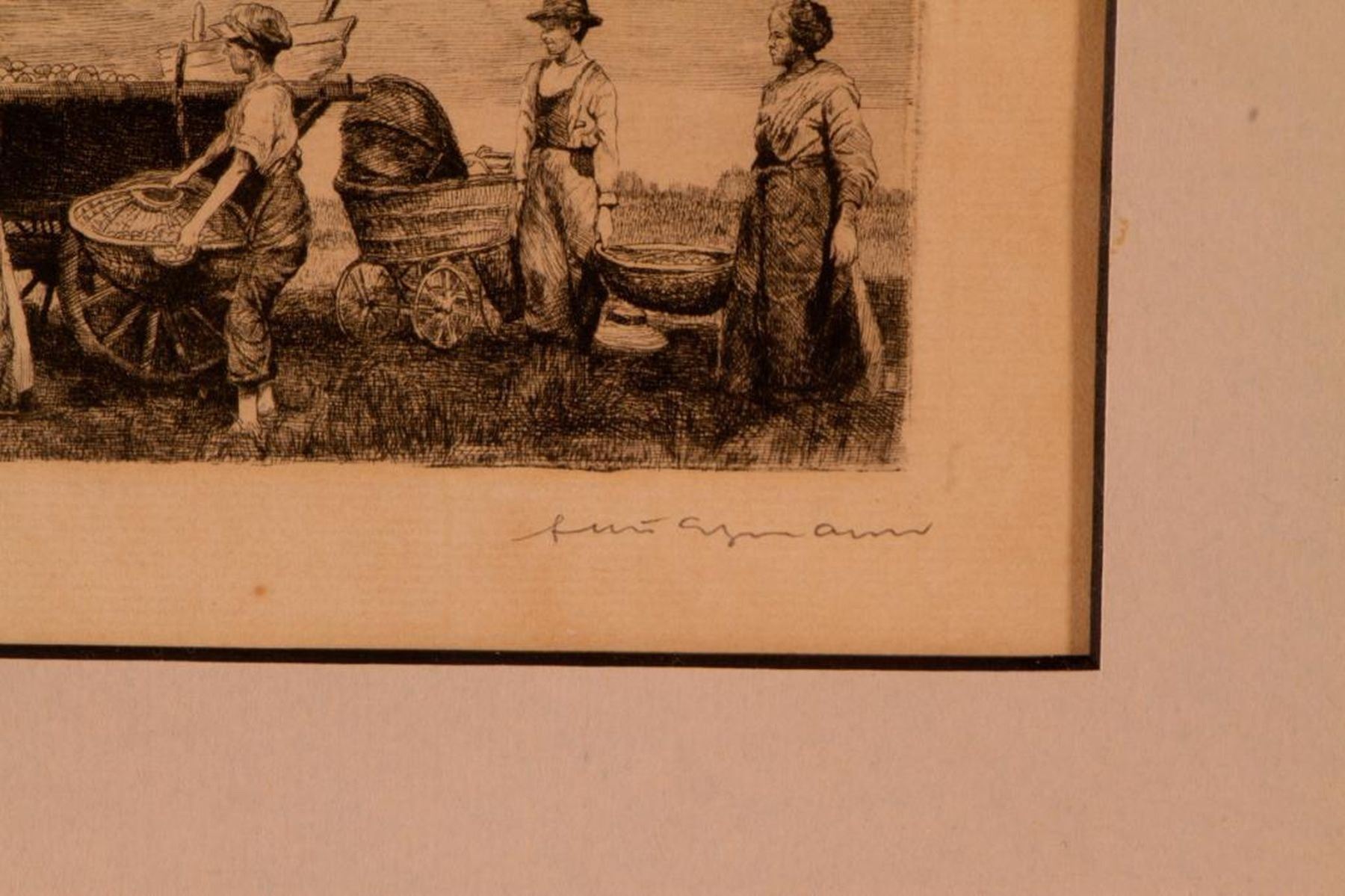 Artist: Illegible. Title/Subject: Harvest scenes. Signature: Lower right. Medium: Etchings. Size frame: 10 1/4" H x 14 1/4" W. Size image: 3 1/2 " H x 7 3/4" W. Created: 19th century. Condition: Good.