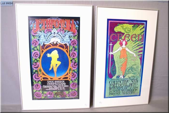 Two framed Bob Masse prints including Jethro Tull at Snug Harbour and Creed at the Desert Sky Pavilion, note both artist signed