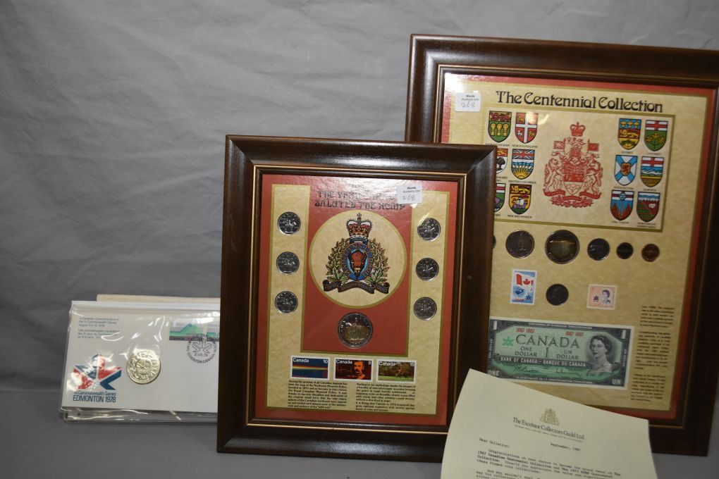 Two framed Canadian collector sets including 1973 RCMP coin set with silver dollar and stamps, and a 1967 Centennial including decimal set, dollar bill and stamps plus two 1978 Commonwealth games medallion sets in collector's pouch.