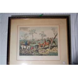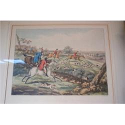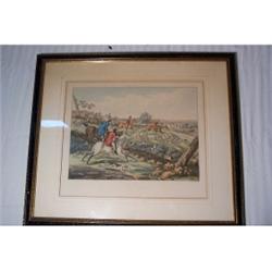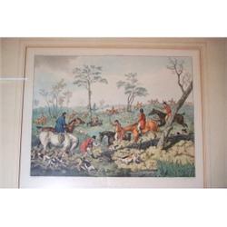Two framed hunt scene prints; 1st print: "Full Cry", H. Alken, det., Sutherland sculpt, Taking the Thing Easy (across top), 13-3/4" w x 11-1/2"h, matting dirty, under glass, London Published Jan., 1818 by S & J Fuller, frame 20'1/2" w x 17-1/2" h, 3 fishbone place; 2nd Print: "Drawing a Cover", Hark to Old Danger (across top)