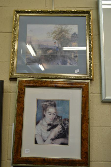 Two framed prints including canal scene and a girl with her kitty cat