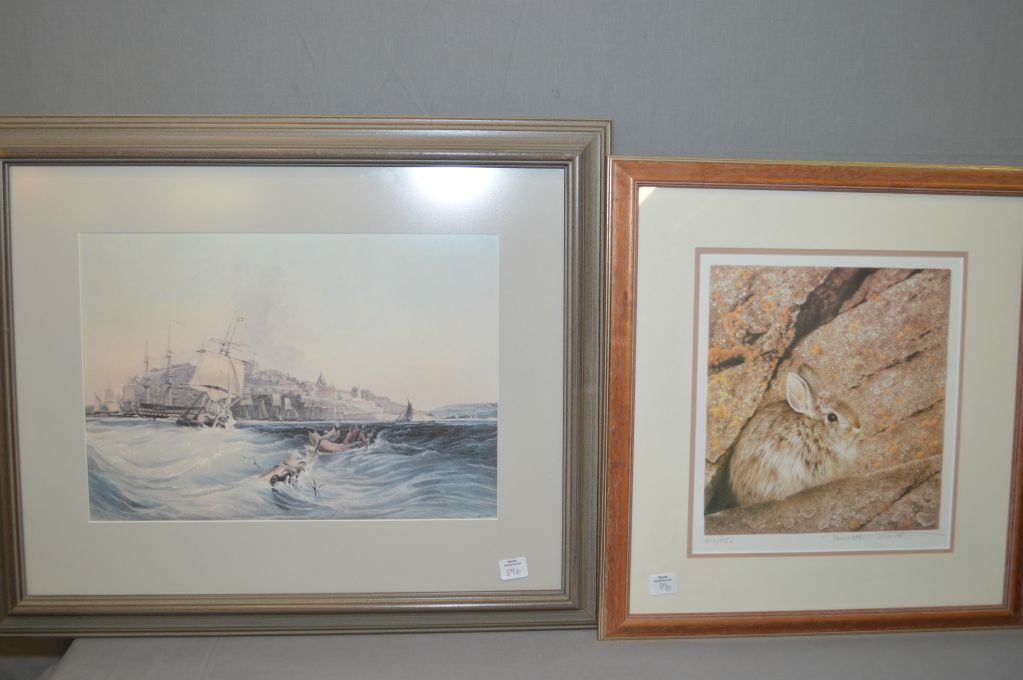 Two framed prints including limited edition rabbit 34/950 signed by artist and ship with shoreline scene