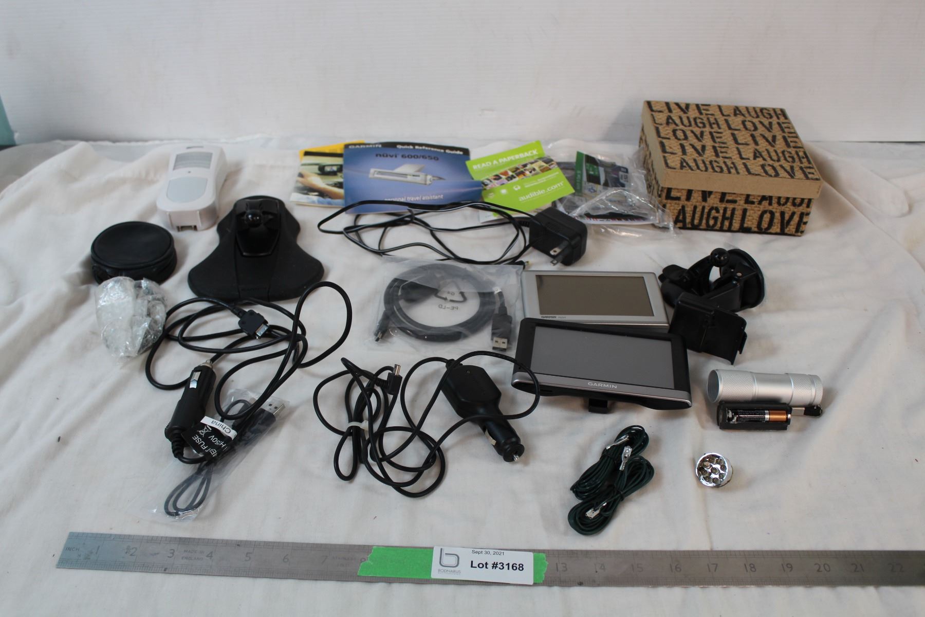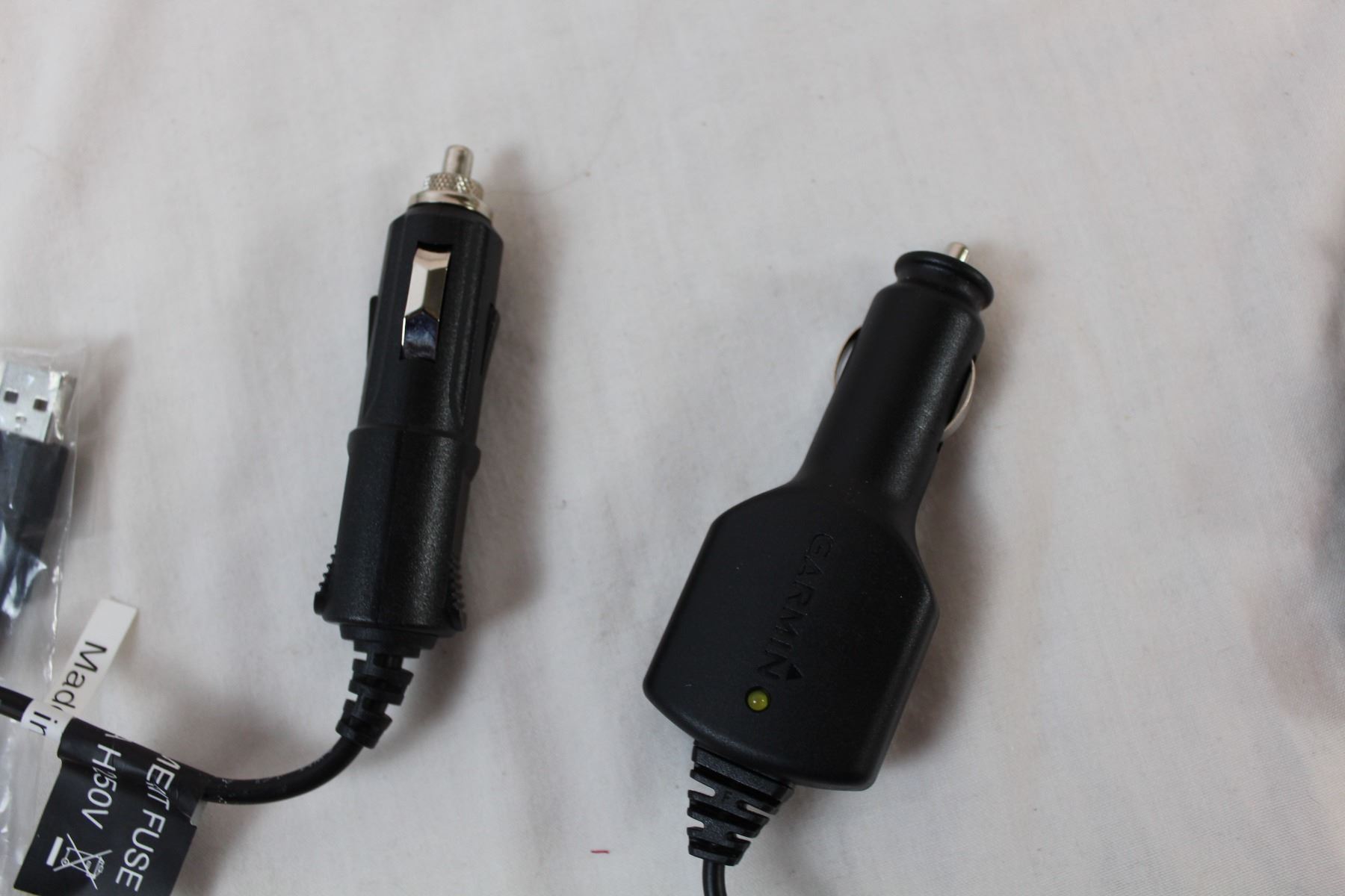 Two garmin GPS with car accesories and various cording, lightmate nightlight