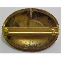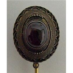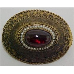 Two garnet pins, 1 1/8" wide oval pin with cabuchon garnet surrounded by seed pearls, metal is gold gilt over brass; and stick pin with oval cabuchon garnet in brass mounting Estimate 100/160