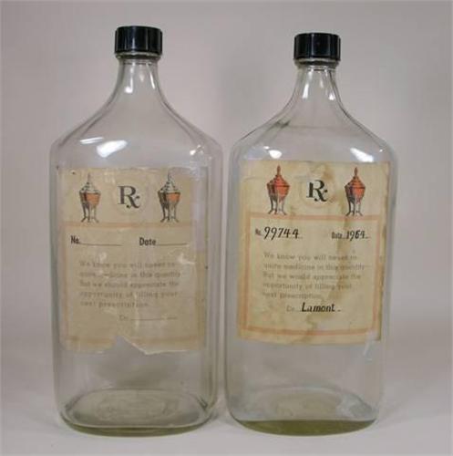 Two glass RX Drug Store Display bottles with paper labels, bottles are made by Duraglass, 21 inches tall each. Good Cond.