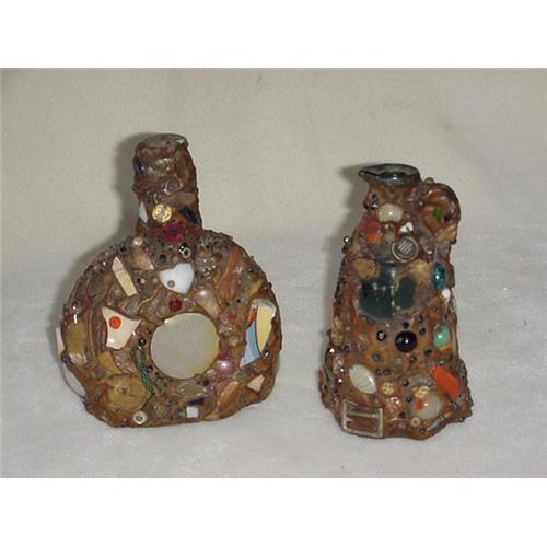Two glass bottles encrusted with beads, bits of glass and other items. Missing some bead work as shown in photos, 6 1/4" x 7" tall.