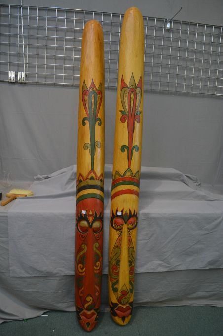 Two hand carved and painted Bali masks both approximately 78" X 6 1/2"