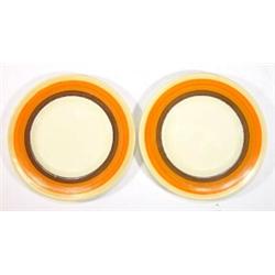 Two hand painted Clarice Cliff orange and brown banded side plates, marks to back, 17cm diameter