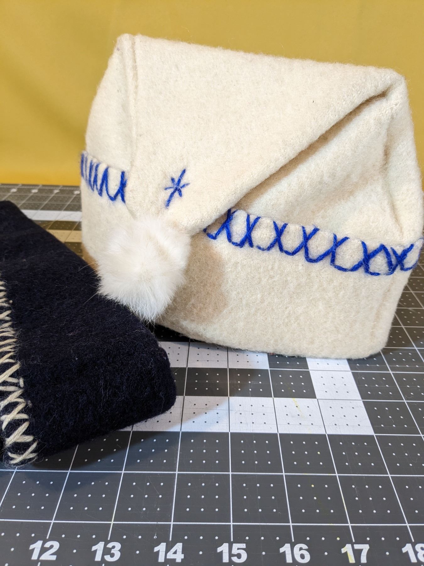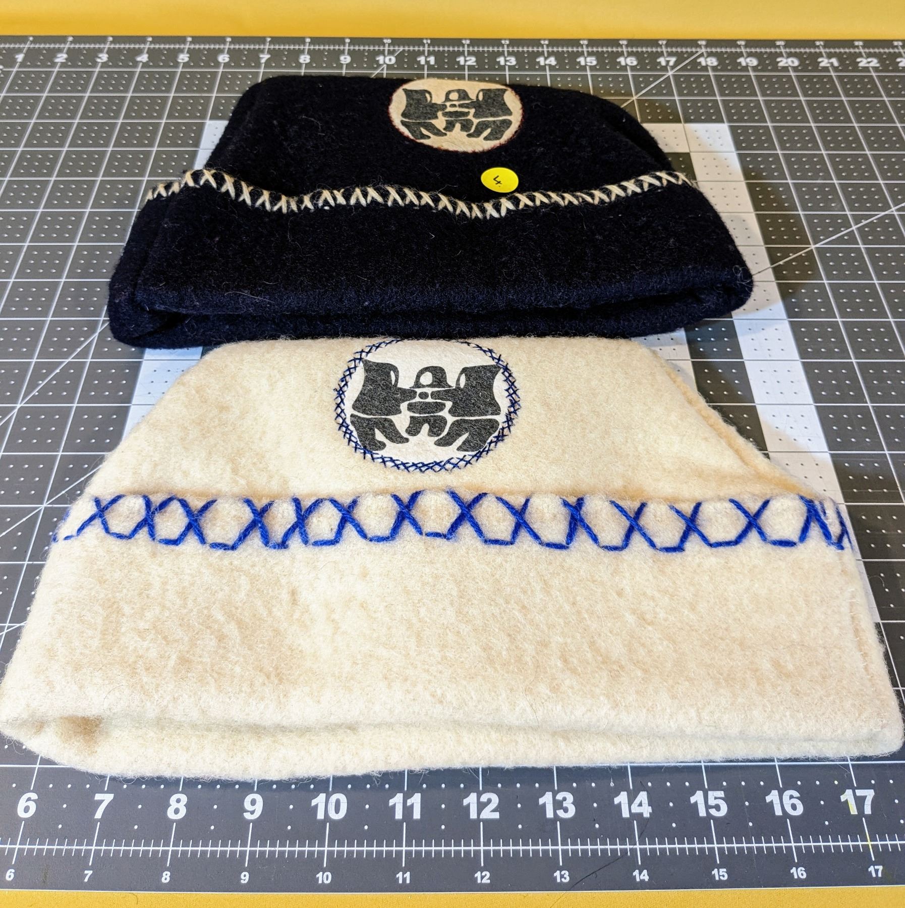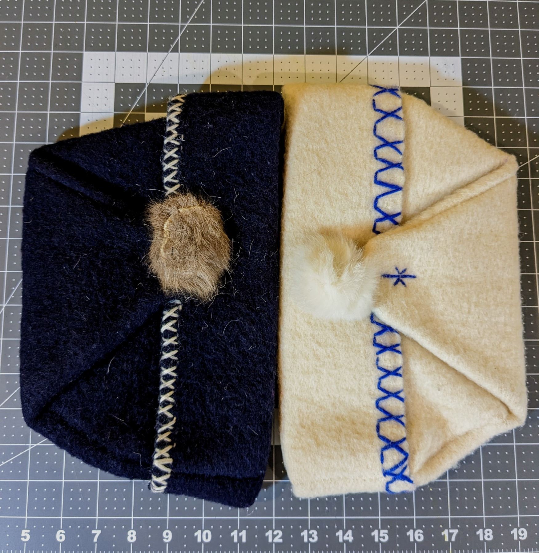 Two heavy wool felt toques with real fur pom pom, in cream and navy. Navy pom pom has some deterioration; cream in excellent condition. Medium.