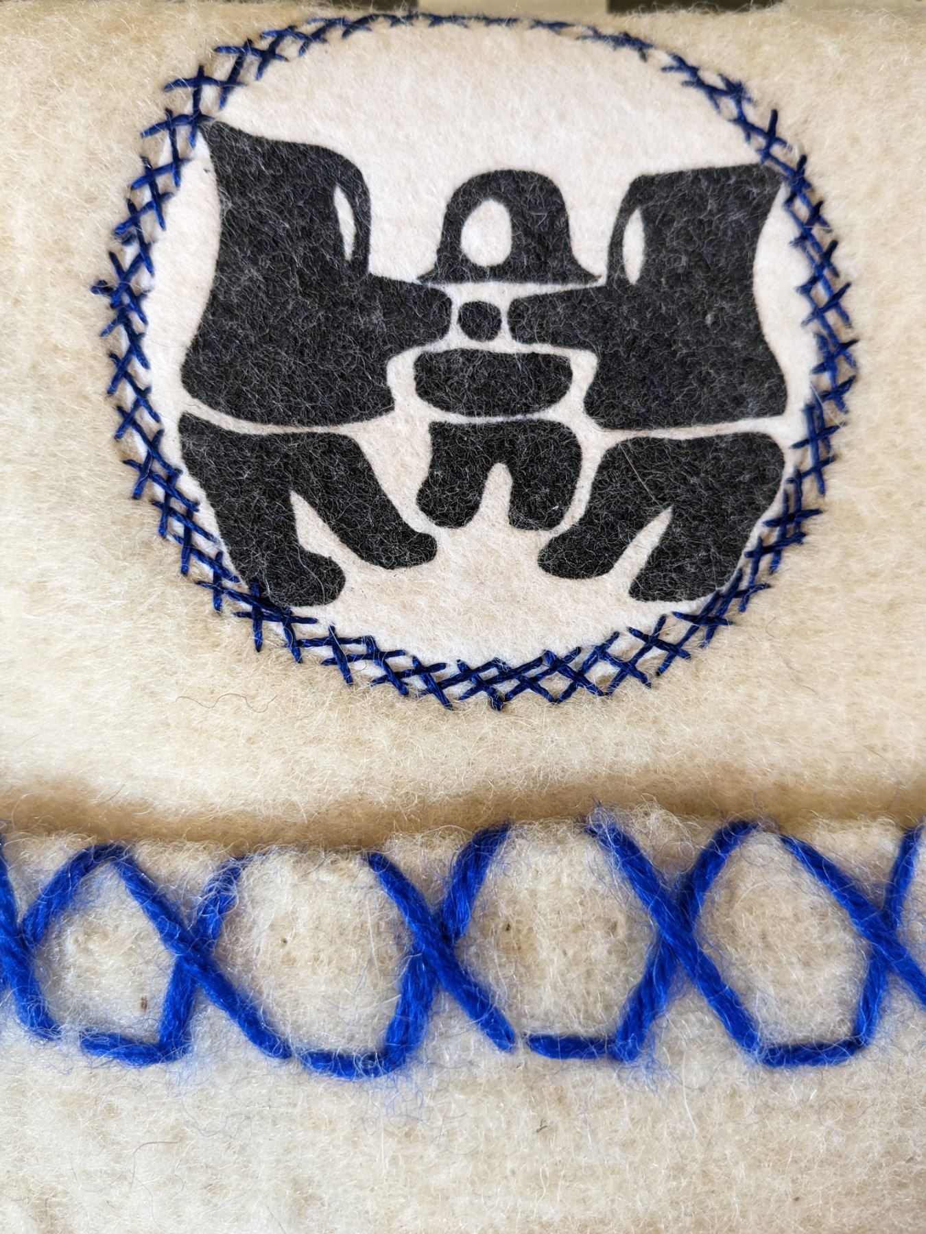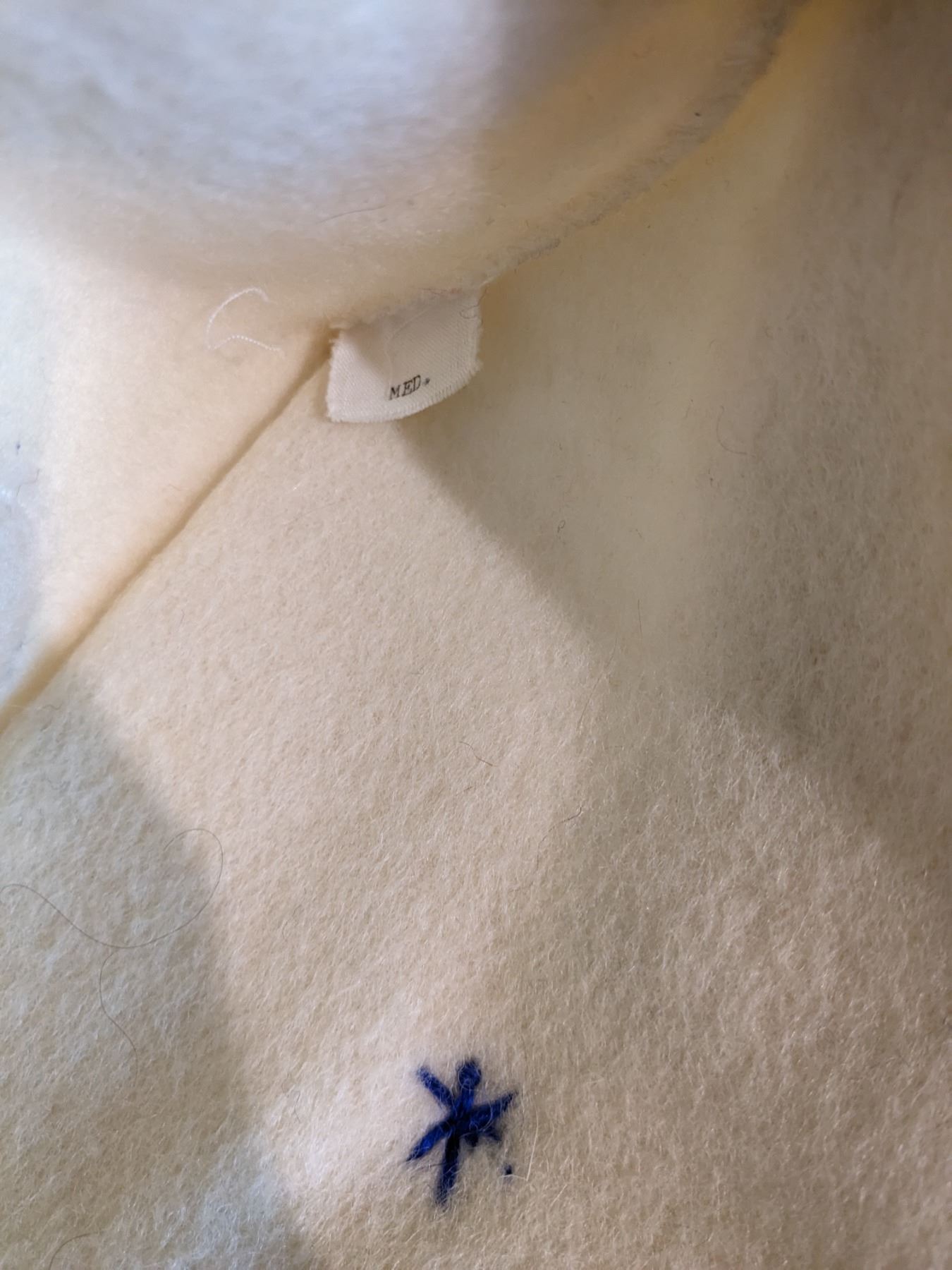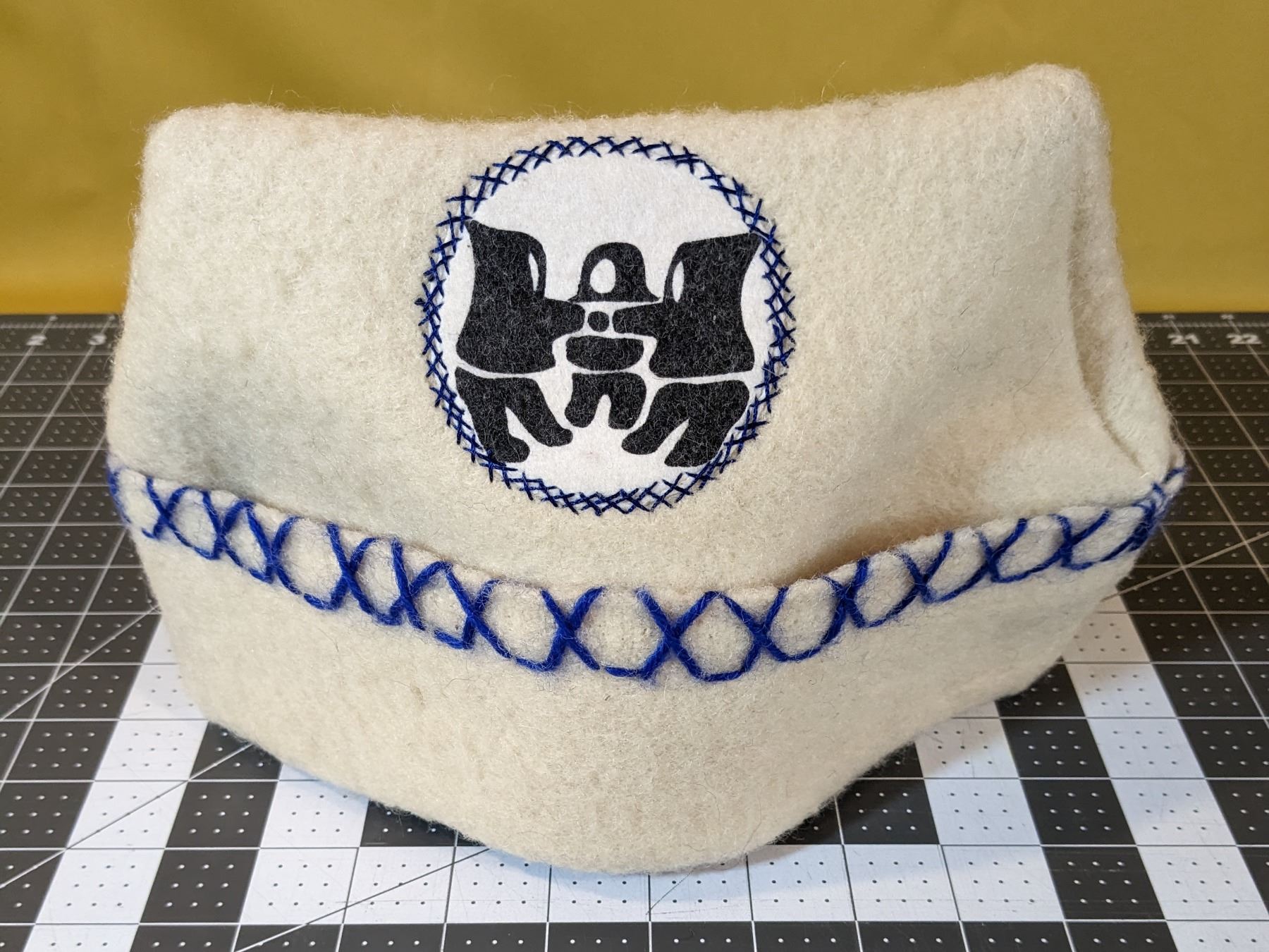 Two heavy wool felt toques with real fur pom pom, in cream and navy. Navy pom pom has some deterioration; cream in excellent condition. Medium.