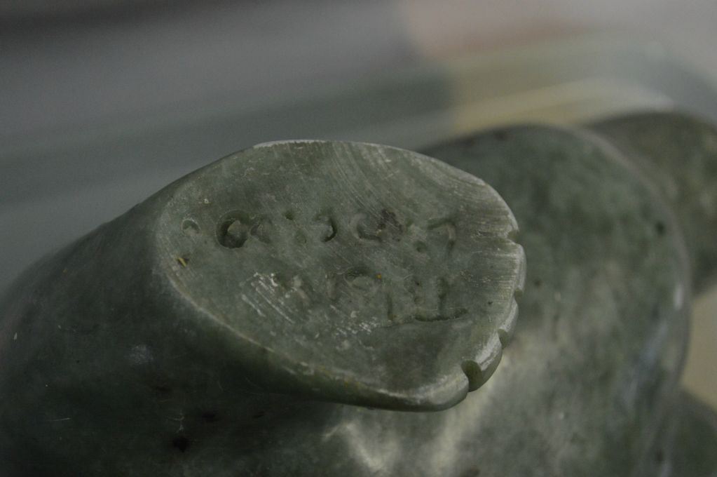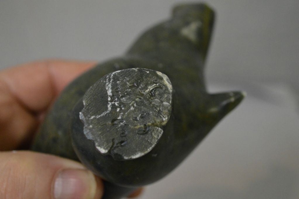 Two inlaid treenware card cases and three soapstone sculptures, note each has been repaired