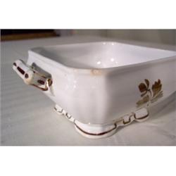 5 1/2" soap dish crazed, no chips; and 6 1/2" square covered tureen with couple of flakes, some discoloration and crazing