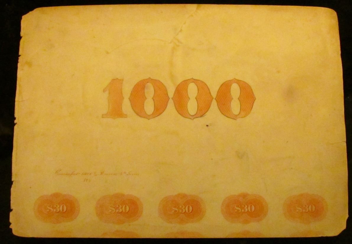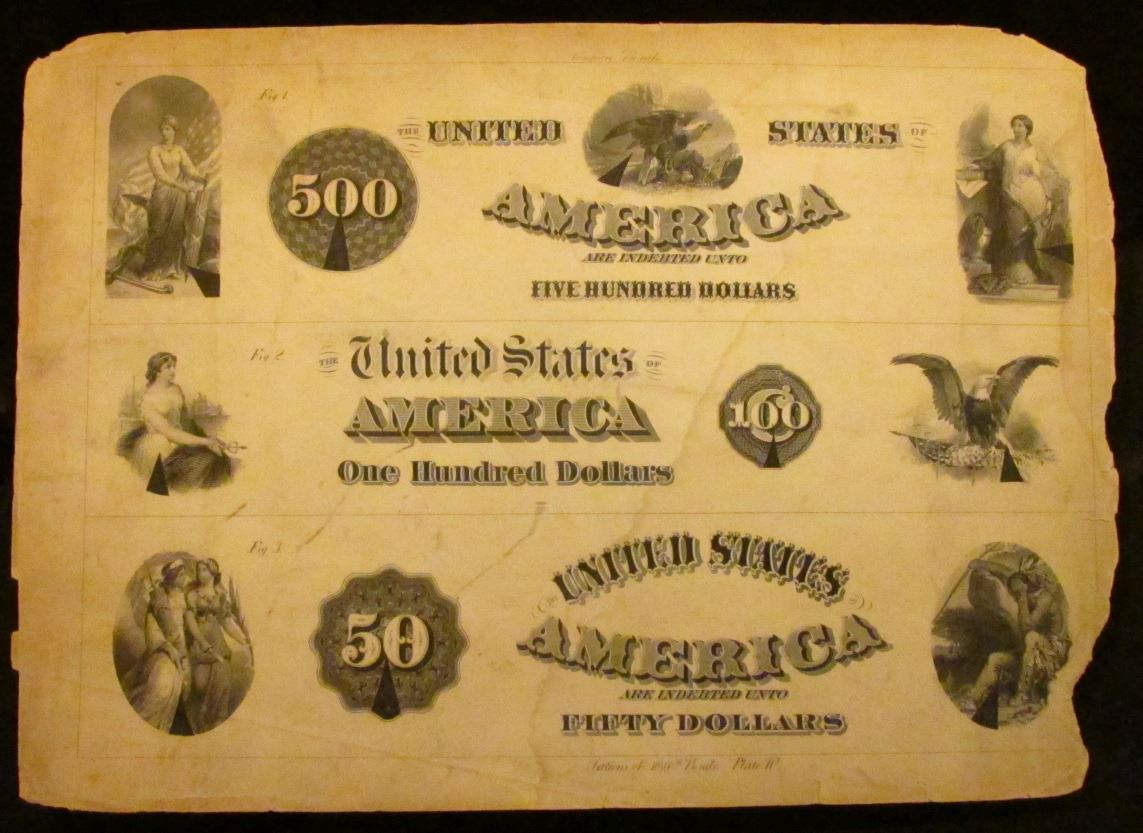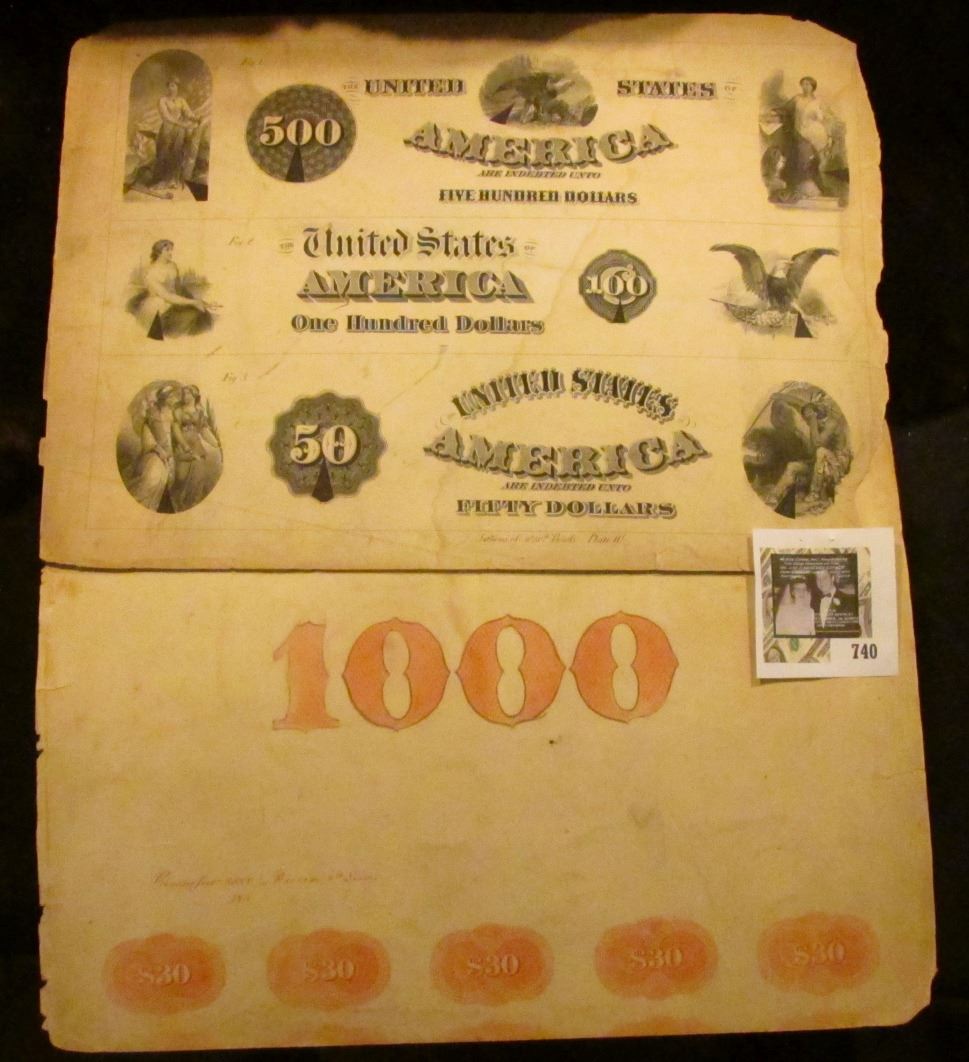 Two large Plate vignettes of Steel Engravings for Bond issues; Counterfeit $1000 5/20 Reverse Fourth Series& $30; and Sections of 10/40th Bonds, Plate 10.