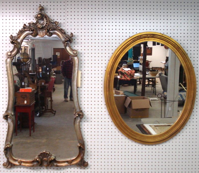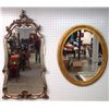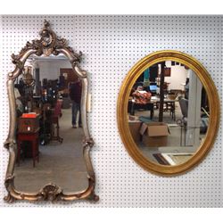 Two large contemporary mirrors 1) in a silvered European style frame - 23" x 48" and 2) an oval mirror in a gilded frame - 27" x 33". Both in excellent original condition.