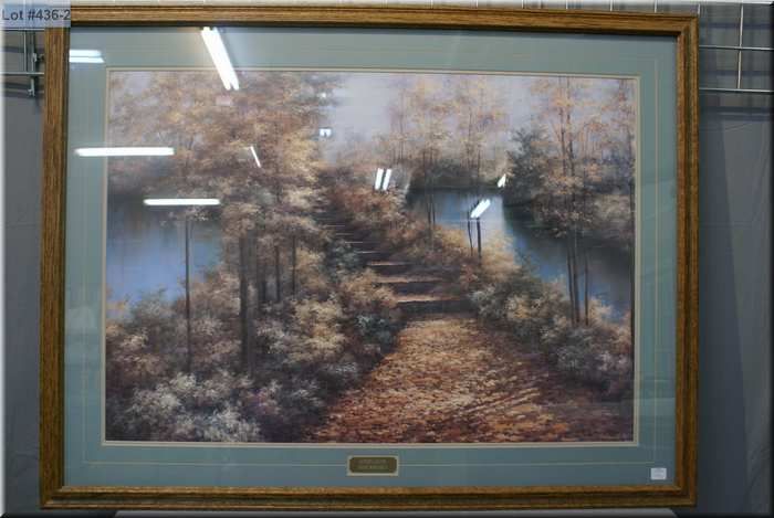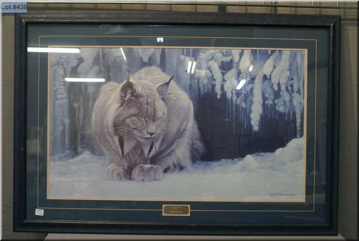 Two large framed prints including "Dozing Lynx" by Robert Bateman and "Autumn Leaves" by Diane Romanello