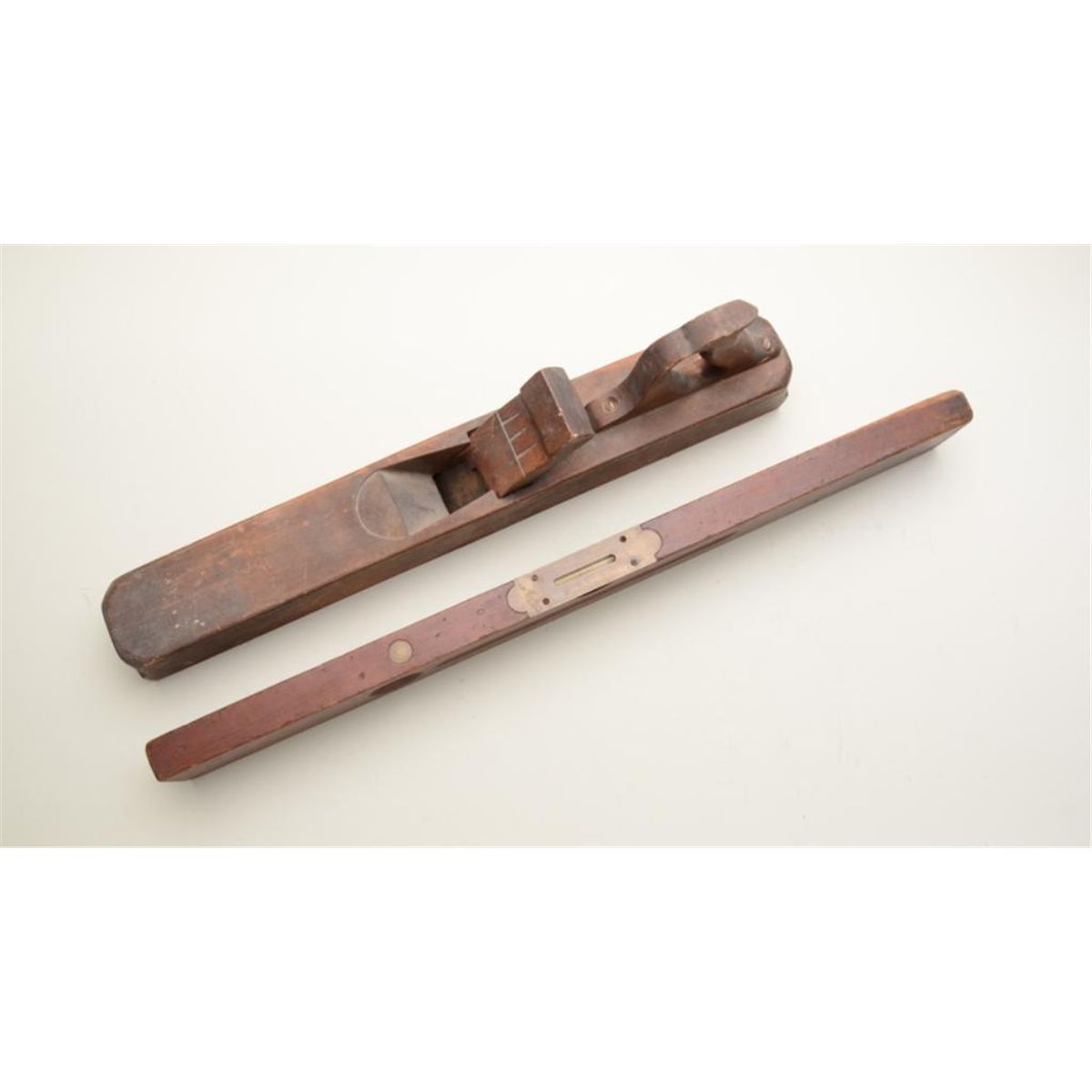 Two large old hand tools including a large wood and brass level, approx. 30” long and approx. 3” wide in overall good condition; also a large wood plane approx. 25” long, one blade and securing wood wedge; both inoverall good condition; great decorator items. Est.: $50-$75.