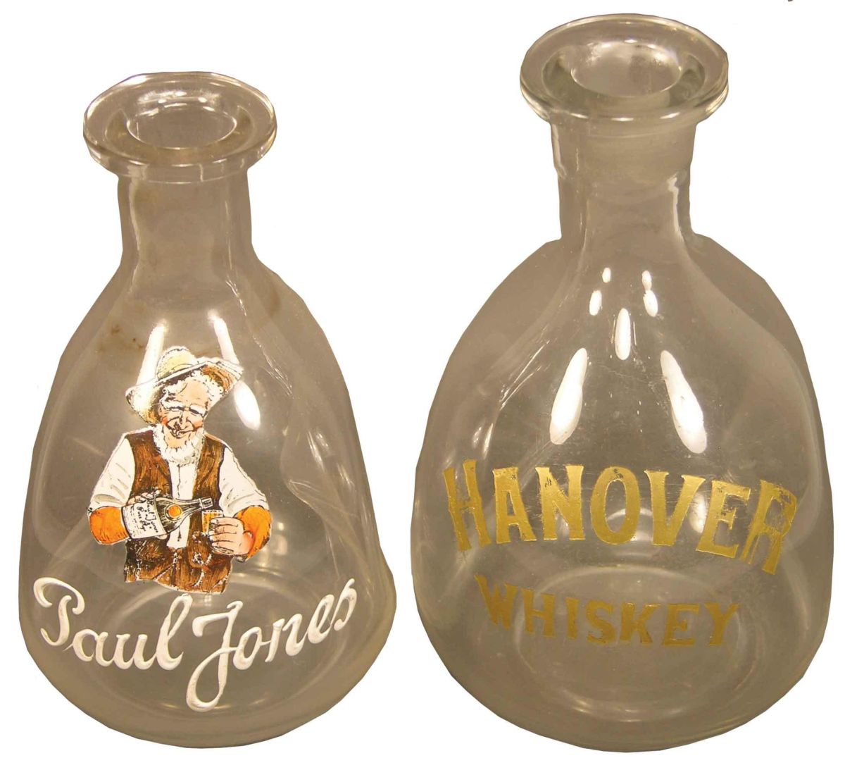 Two liquor pinch bottles, enameled multi-color for Paul Jones and etched for Hanover Whiskey. No chips or cracks. Aprox. 7 inches tall.