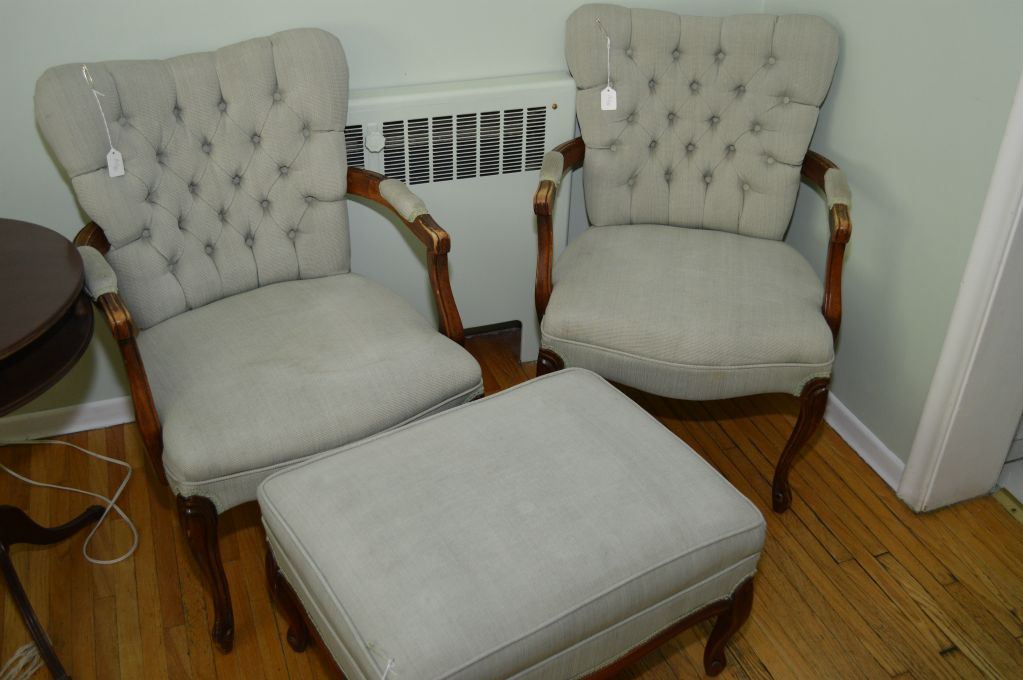 Two matching open armed button tufted upholstered parlour chairs and a matching footstool
