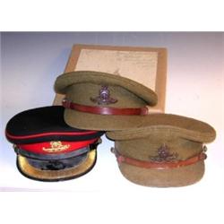 Two mid 20th century Royal Artillery officers caps in khaki and another dress cap in red blue with..