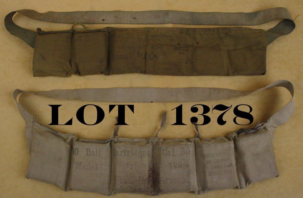 Two military bandileros of .30 caliber ammunition for the Model 1898 Springfield rifle; one complete, the other with only three pouches full. Est.: $35-$65.