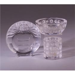 Two modern LALIQUE ashtrays including "Tokio," with a matching cigarette holder. Engraved Lalique France. Average dia. 13cm