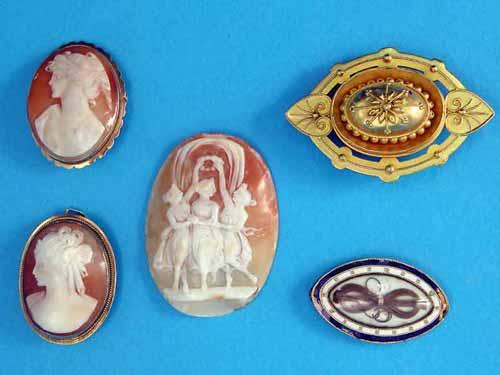Two modern shell cameo brooches, an unframed shell cameo carved with dancing muses, a Victorian brooch and a Regency navette shaped enamel memorial clasp (a.f) £100-150