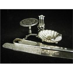 Two modern silver letter openers, a miniature table and chair, and shell salt and spoon Est. 100/150