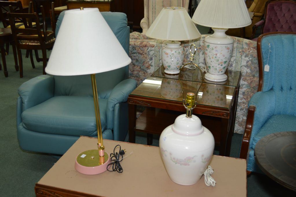 Two modern table lamps including white porcelain lamp and pink lamp with adjustable arm