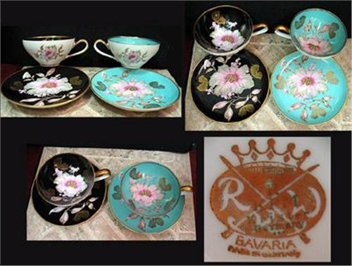Two nice ornate cups and saucers "RKW Bavaria" with a green KPM over stamp. No chips or cracks