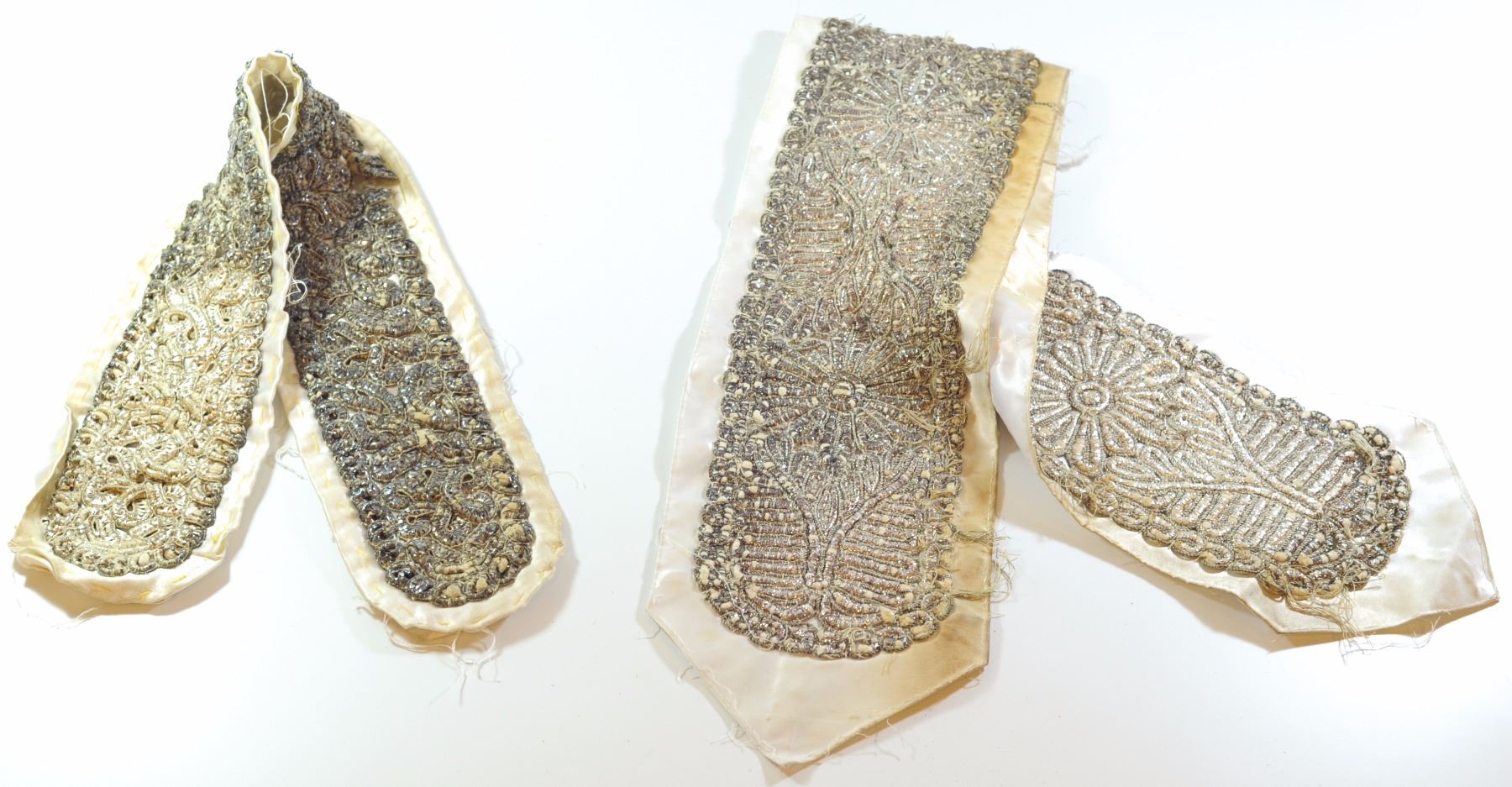 Two old Tallit Atarot (neck bands) with woven silver strings, length: 66-100 cm.