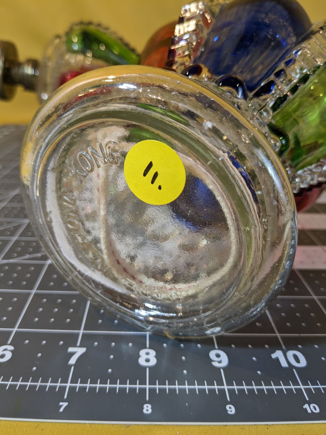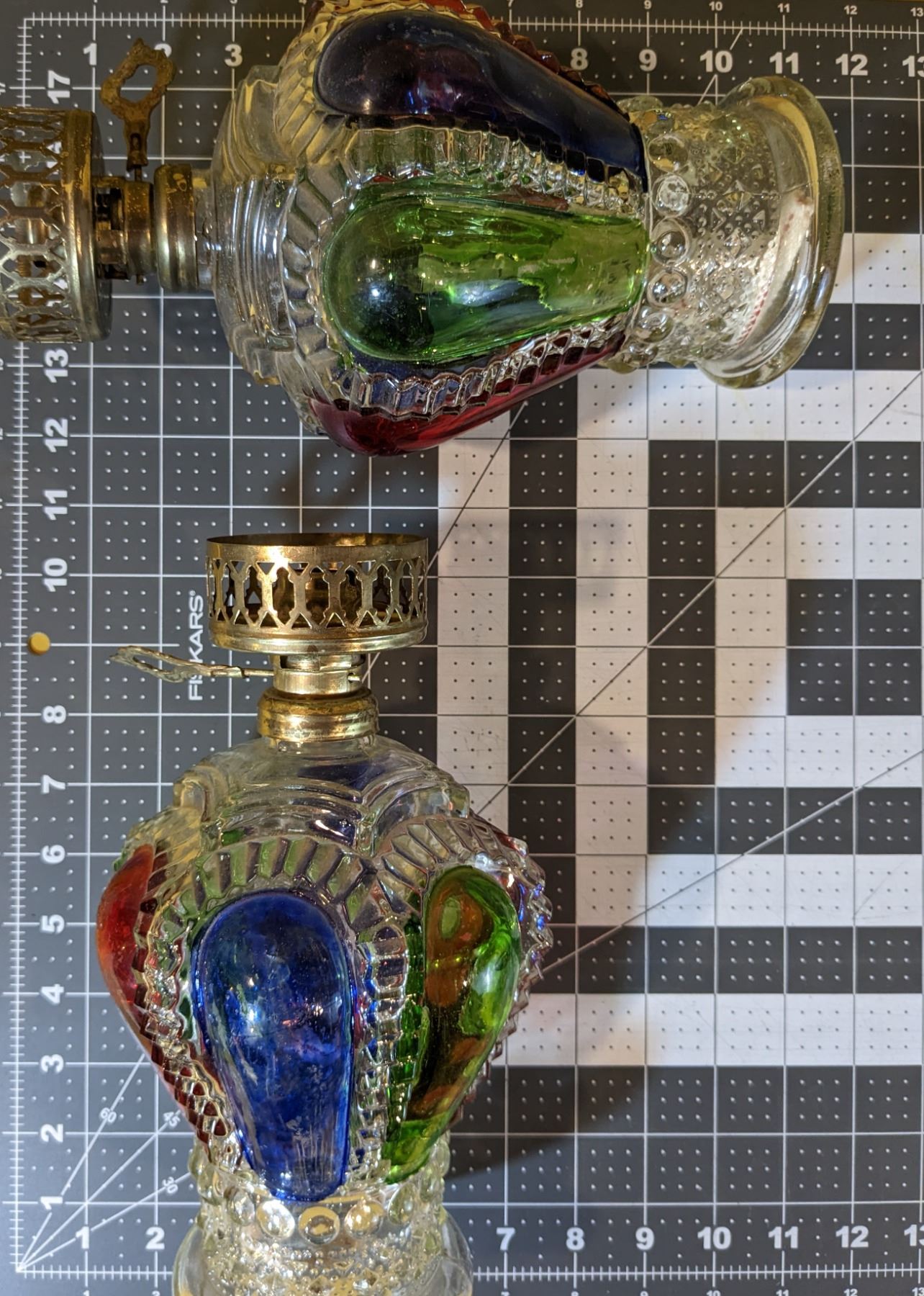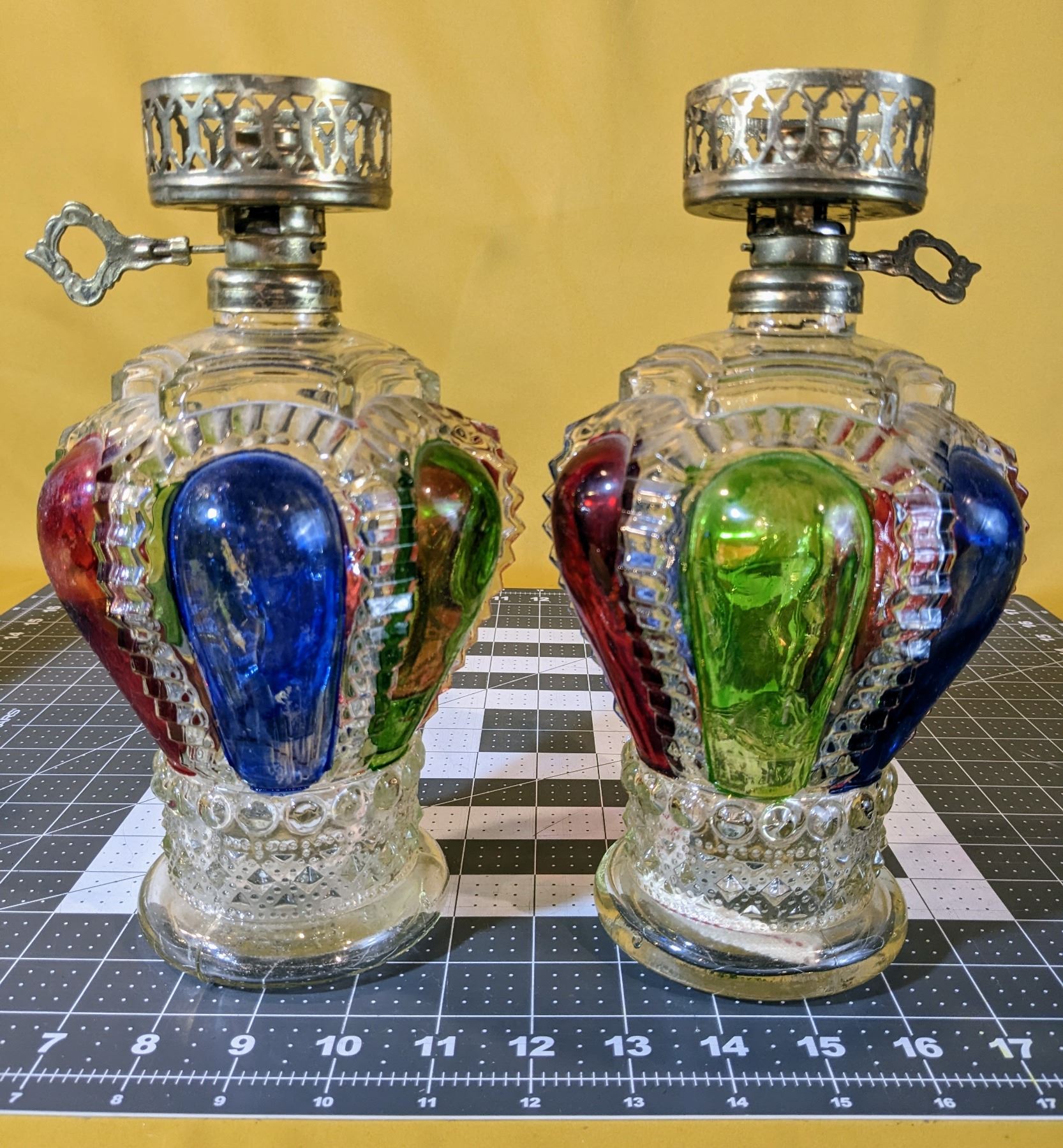 Two old hong kong coloured glass kerosene oil lamps. 10 in tall. Unused.