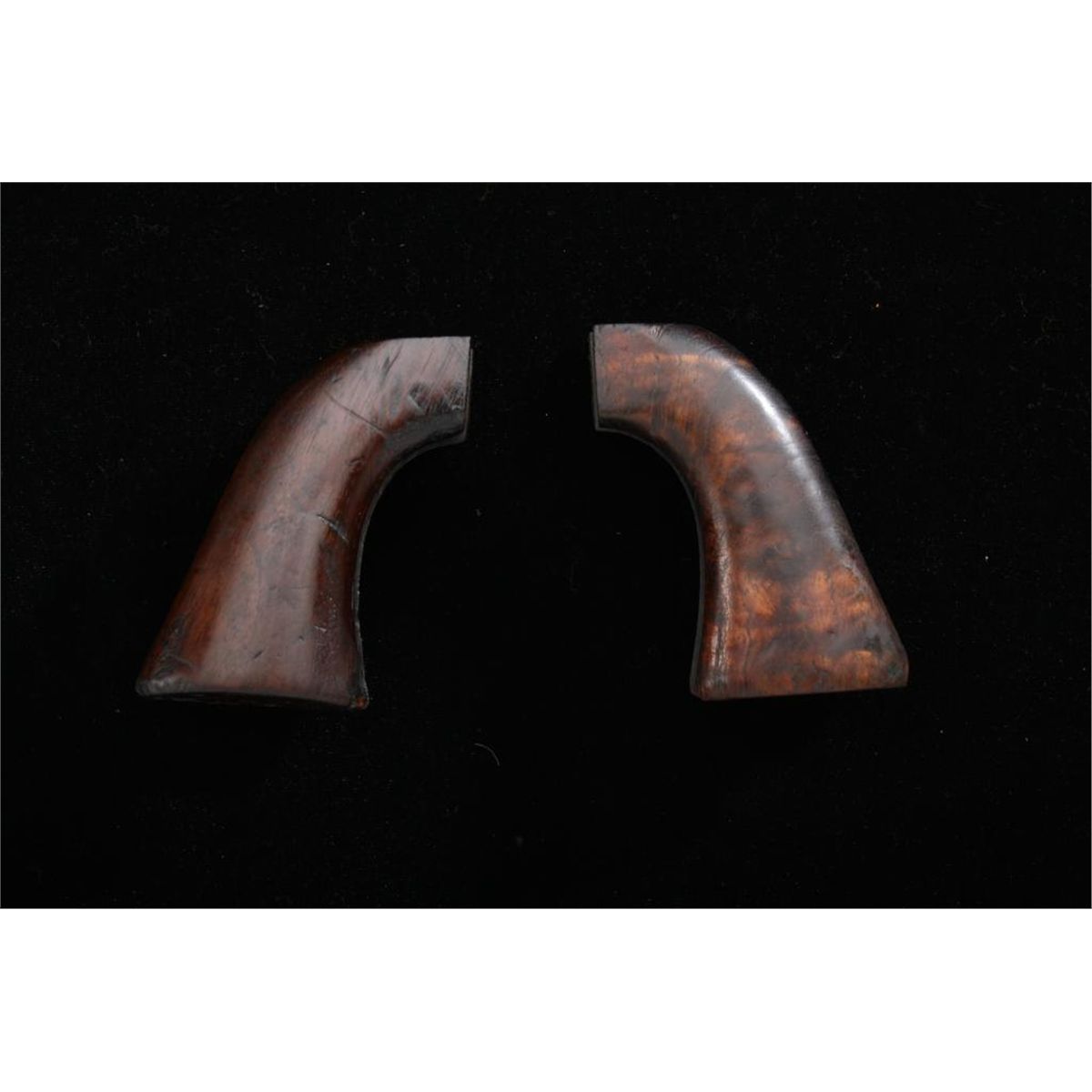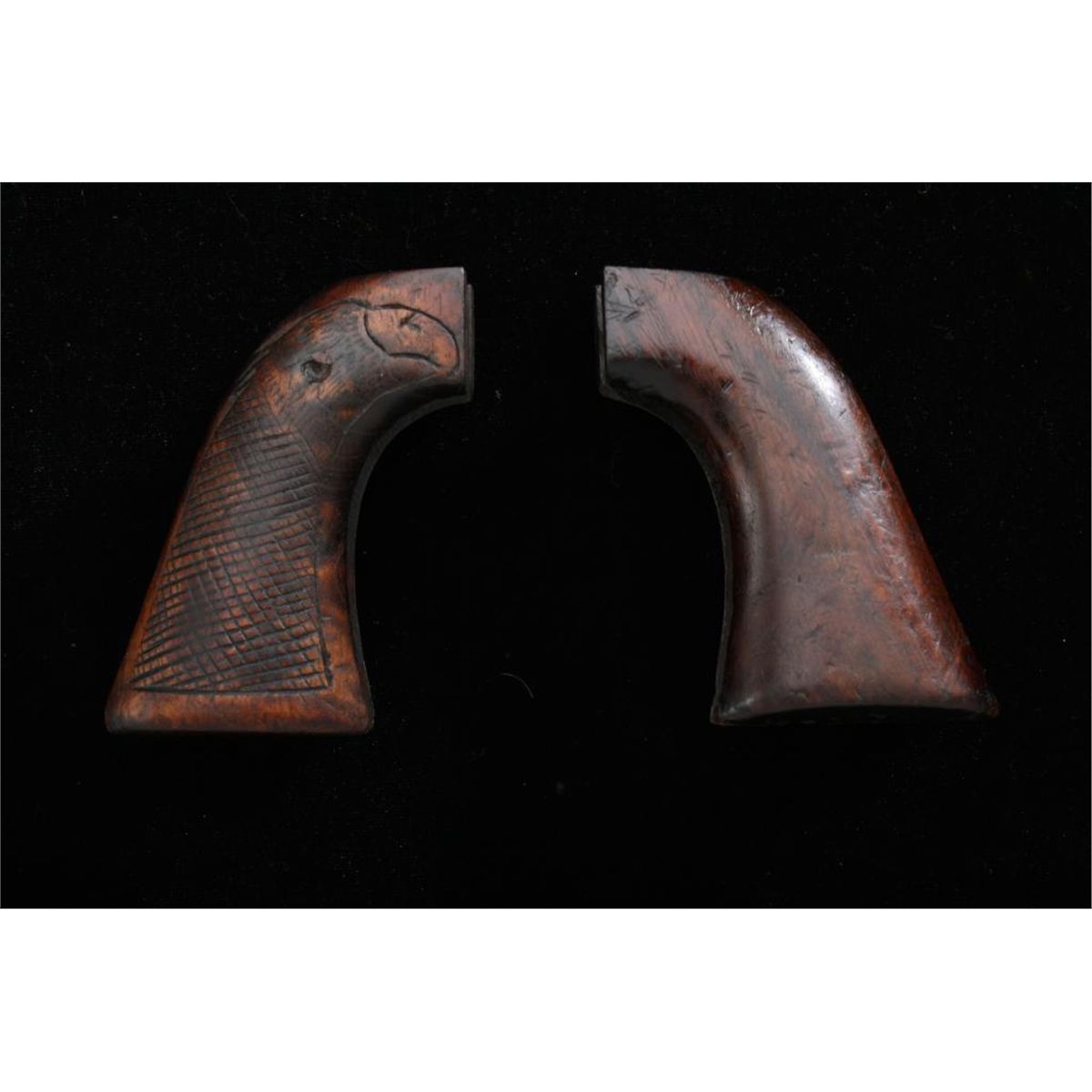 Two pair of wood grips for a Colt Model 1860 Army percussion revolver, one is in overall very good condition with some scattered old nicks and mars from carry; the other is overall fair to good with wear and whatappears to be a crudely hand carved checkering and eagle head. Est.: $100-$200.