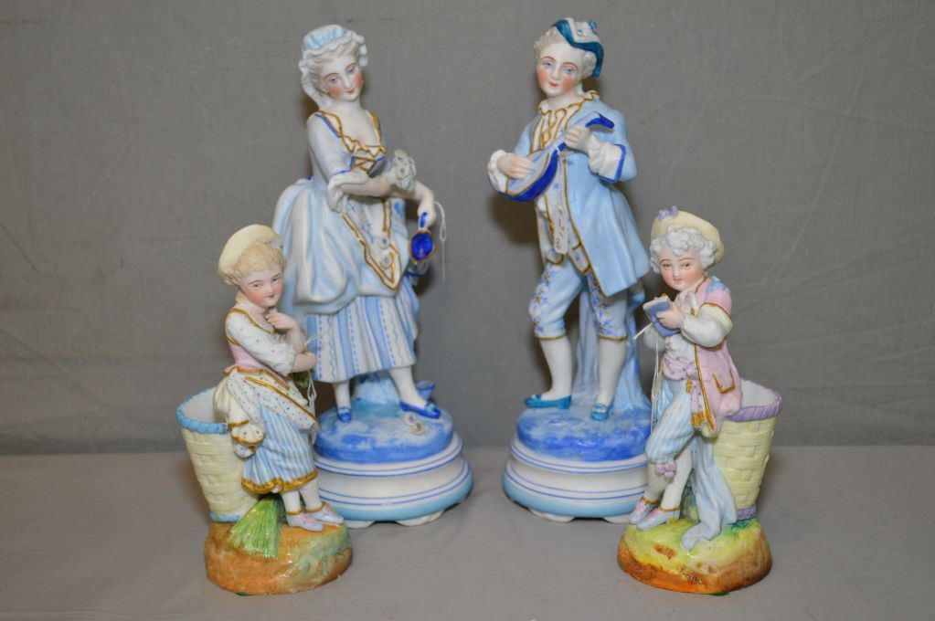 Two pairs of German bisque figurines including gentleman and lady 11" in height and a pair of small bisque figural vases 7 1/2" in height, all hand painted