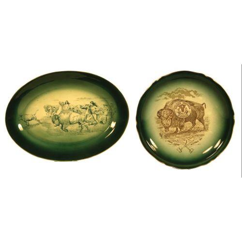 Two Pieces of Buffalo pottery. A large platter, depicting buffalo hunt and a souvenir plate from head Camp, Western Woodmen of America held at Buffalo, June 1911. Both in excellent condition with no chips or cracks. Platter is 15 X 11 inches.