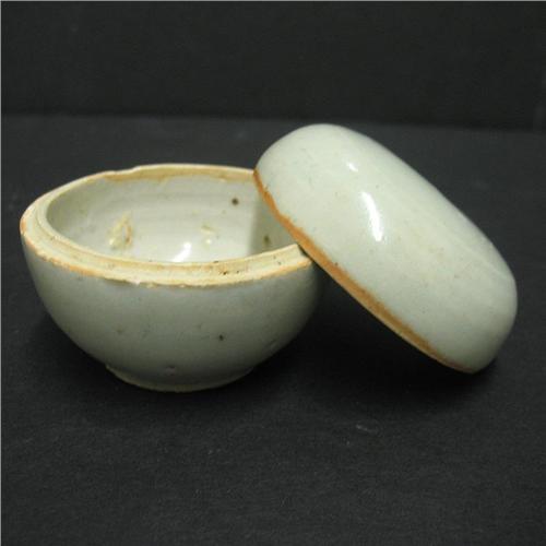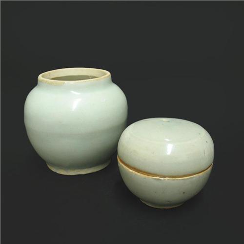 Two pieces Chinese Ying Ching ware including small porcelain box with lid, 2 1/2" high, with bluish celedon glaze, attributed to the 14th C. (small chip on base); and a celadon bowl, 3" high x 3" diameter, (no visible defects); both with 1982 receipts from the Oriental Gallery in Lahaska, PA