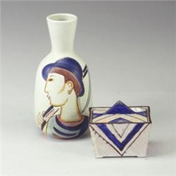 Two pieces: a RORSTRAND vase by Carl Harry Stalhane, 1940s, decorated with a man and woman in profile; and a German Art Deco ceramic box in blue, yellow, and brown glazes on a white ground. A couple of glaze flakes. Both marked. 7 3/4" and 3 1/4" x 3 3/4" x 2 3/4" $100 - 200