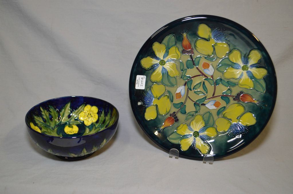 Two pieces of Moorcroft pottery including Buttercup bowl and 10" diameter Hypericum plate