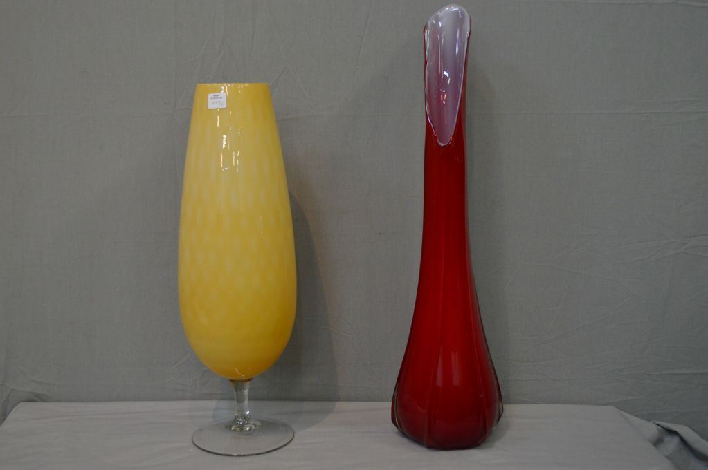 Two pieces of art glass including 19" champagne colour vase on clear base and candy apple red vase 24" in height