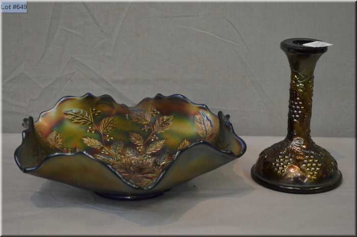 Two pieces of vintage carnival including a leaf motif bowl 9" across and a leaf motif candlestick