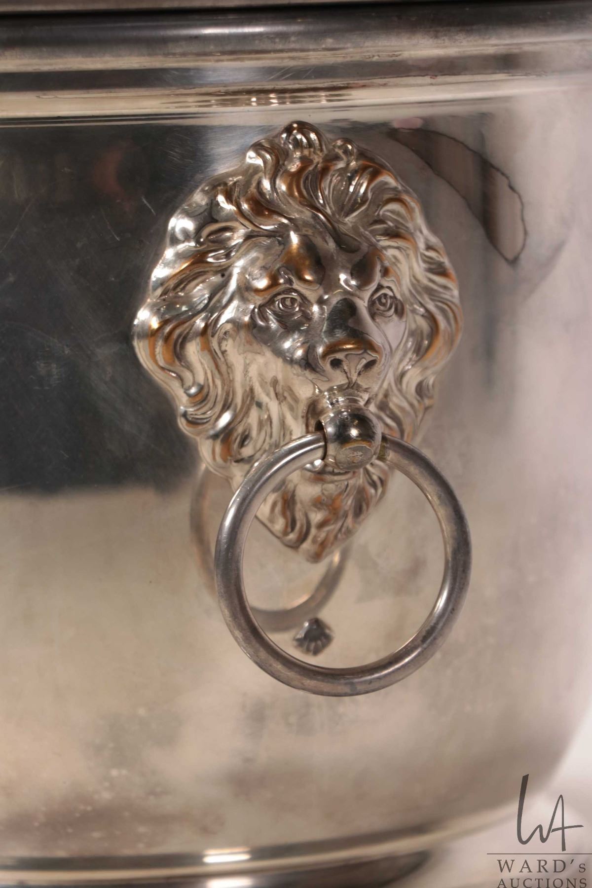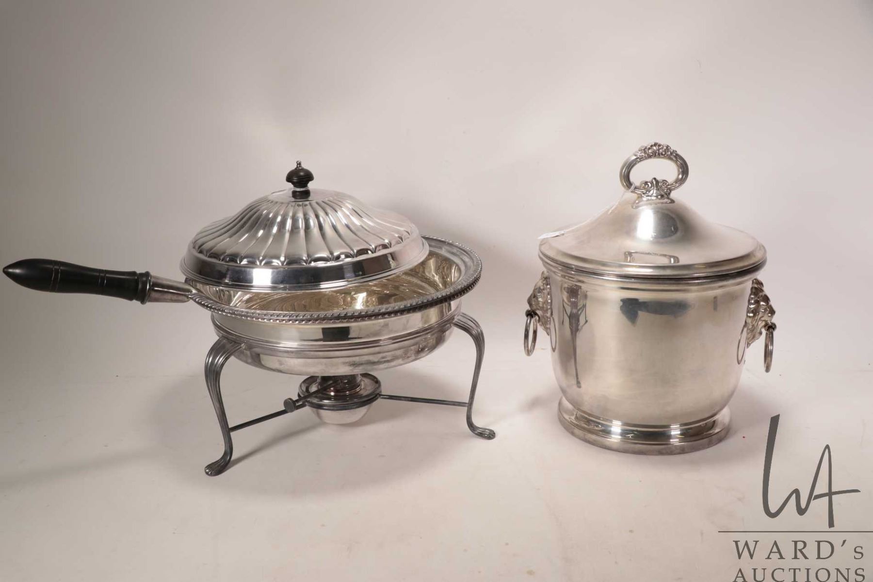 Two pieces of vintage silverplate including Winthrop lined lidded ice bucket with double lion motif handles and a lidded chafing dish with spirit burner