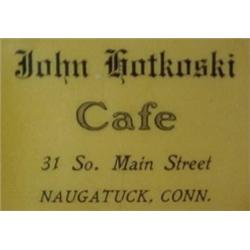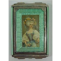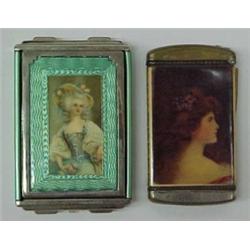 Two portrait pieces; matchsafe and compact, advertising match safe from Cafe in Naugatuck Connecticut, celluloid over plated brass, 2 1/2", celluloid has small crack and green enameled chrome compact marked Girey, contents unused, 1 3/4" long