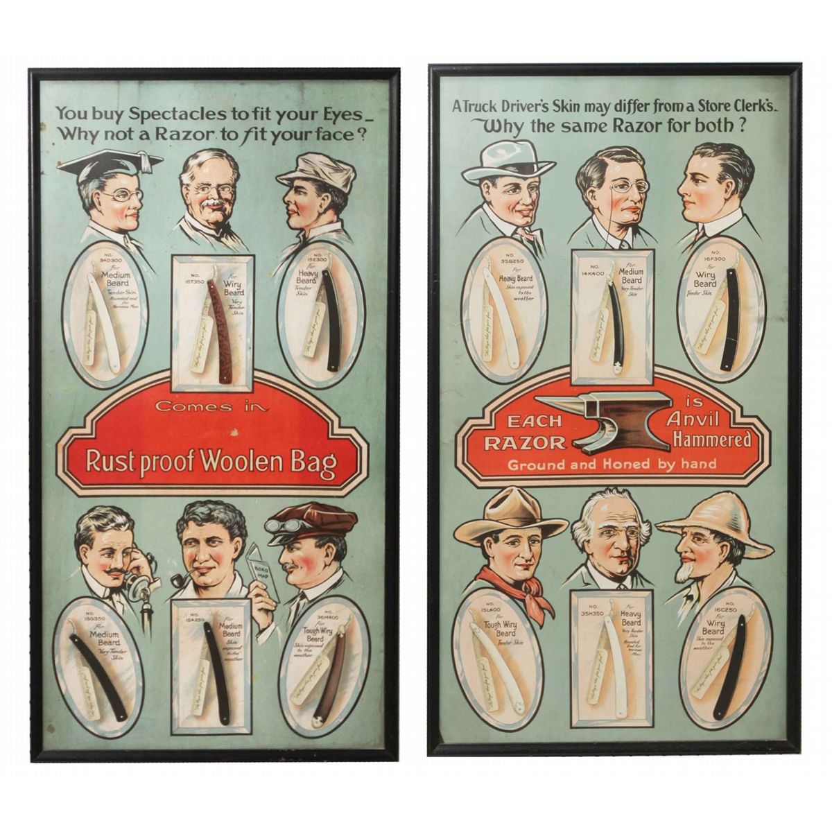 A pair of framed straight razor advertising posters for the "Robeson Shuredge Cutlery Co." Each poster shows images of 6 different men with recommendations for which of the 12 different straight razor models would be best for each type of person. A few minor scuffs otherwise Very good condtion. Each 21x40".
