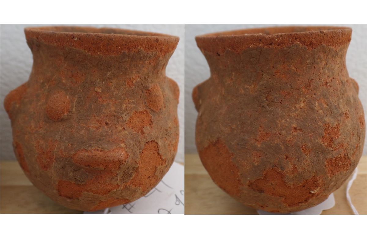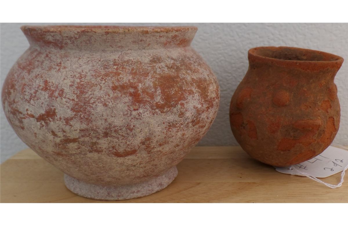 Two pre-Columbian pots from about 100 AD. This items measure 3 x 3 and 4 1/2 x 4 inches. They are in as found condition and are believed to be Nayarit, Mexico. Items have mineralization. Both are in tact. Shipping $20.00