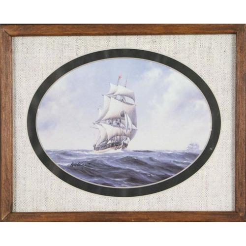**2** Kenneth Grant, Sailship, classical maritime print. This 7.5? x 9.5? print of a painting by Kenneth Grant, depicts the world of sailors with accuracy of detail and almost tangible sense of atmosphere. The full sails and rolling waves give the feel of a windy day out on the ocean so convincingly you can almost taste the saltwater spray. This picture is framed in a good-looking 8.5? x 10.5? stained wood frame that imitates the wood colors of the ship. Both frame and print are in good condition.