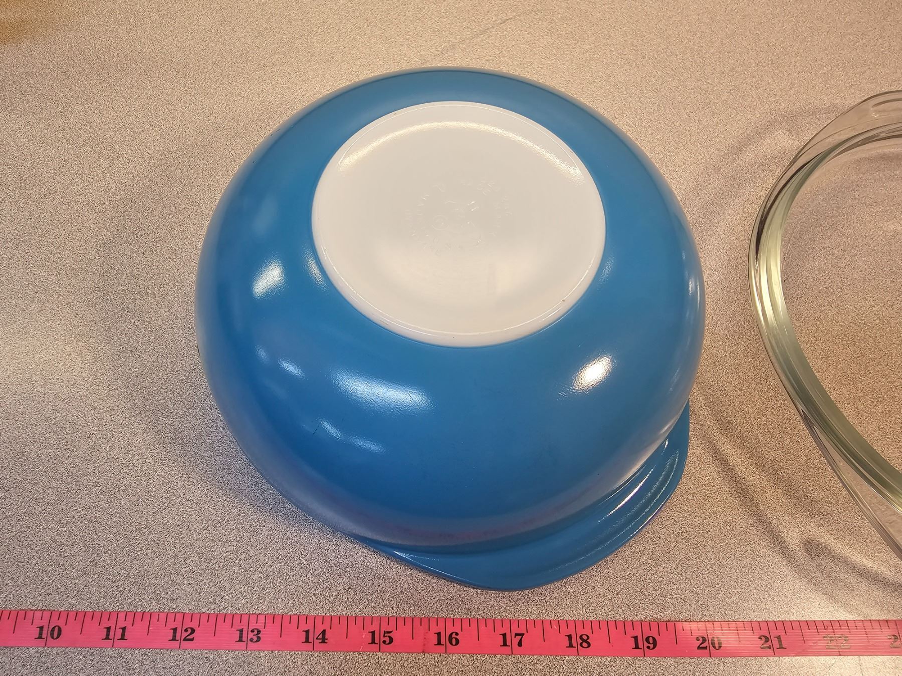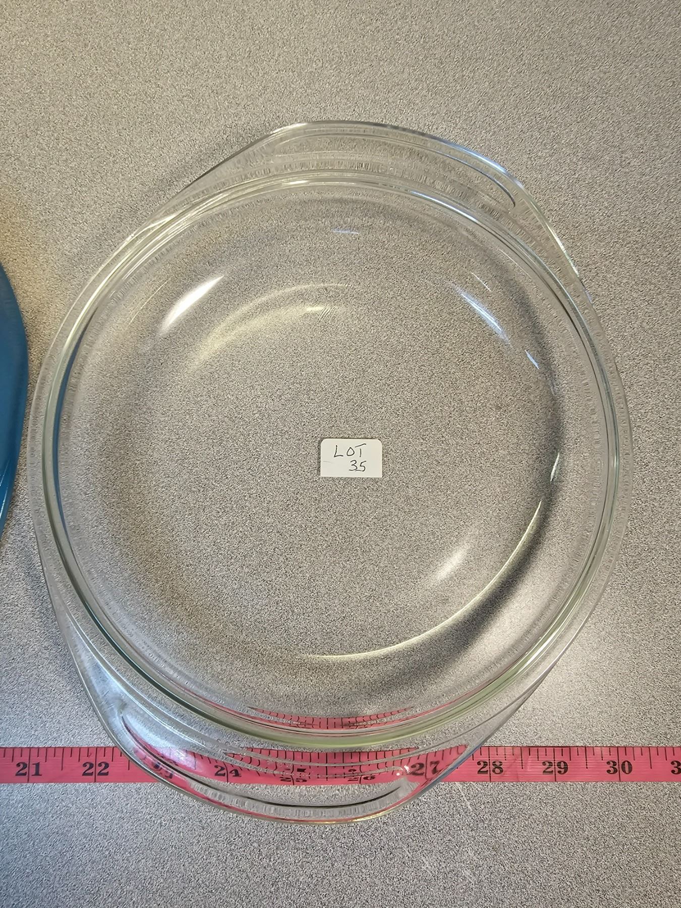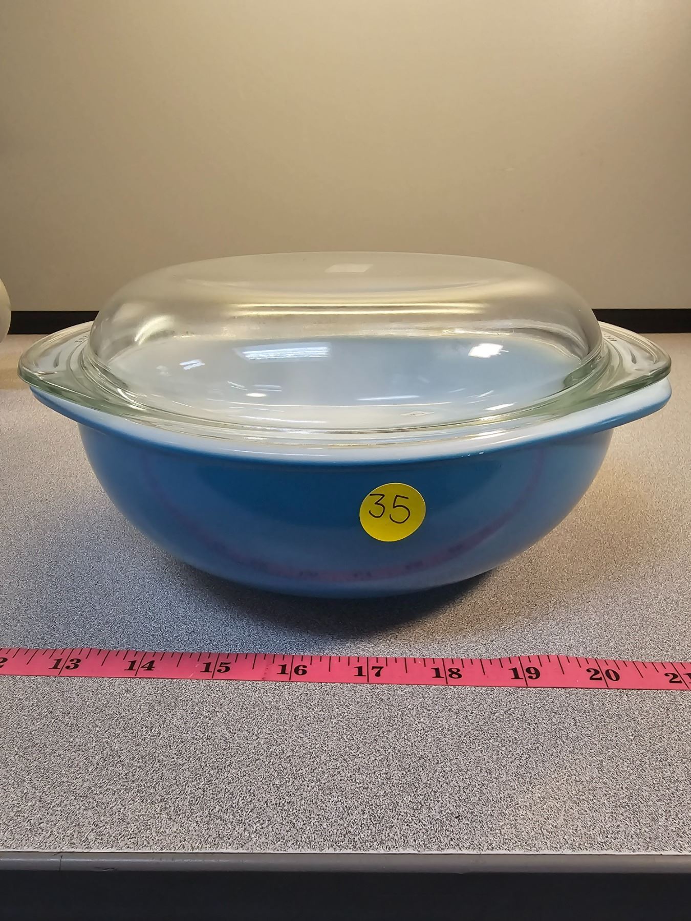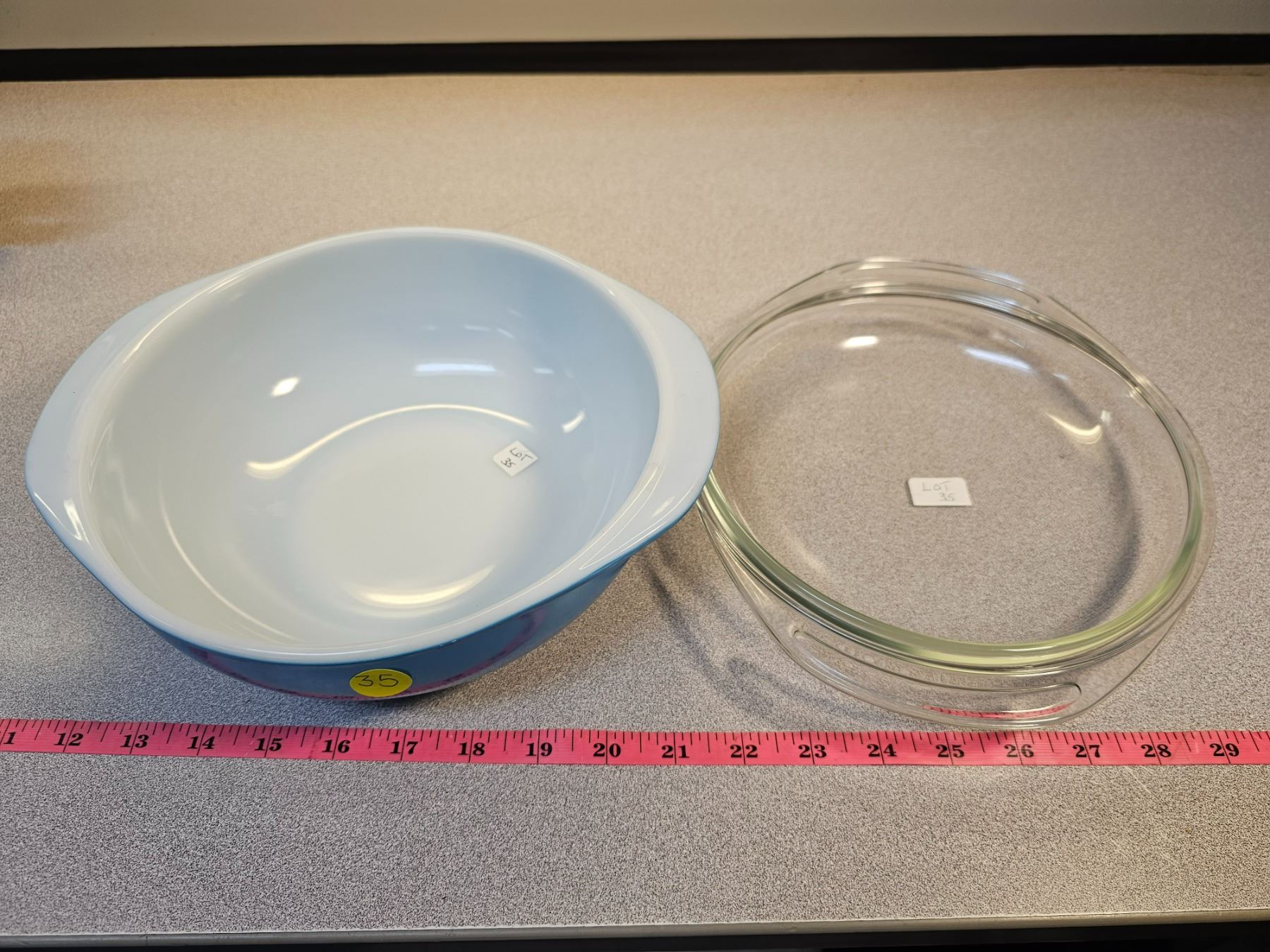Two quart Pyrex blue round baking dish, clear lid, very good condition