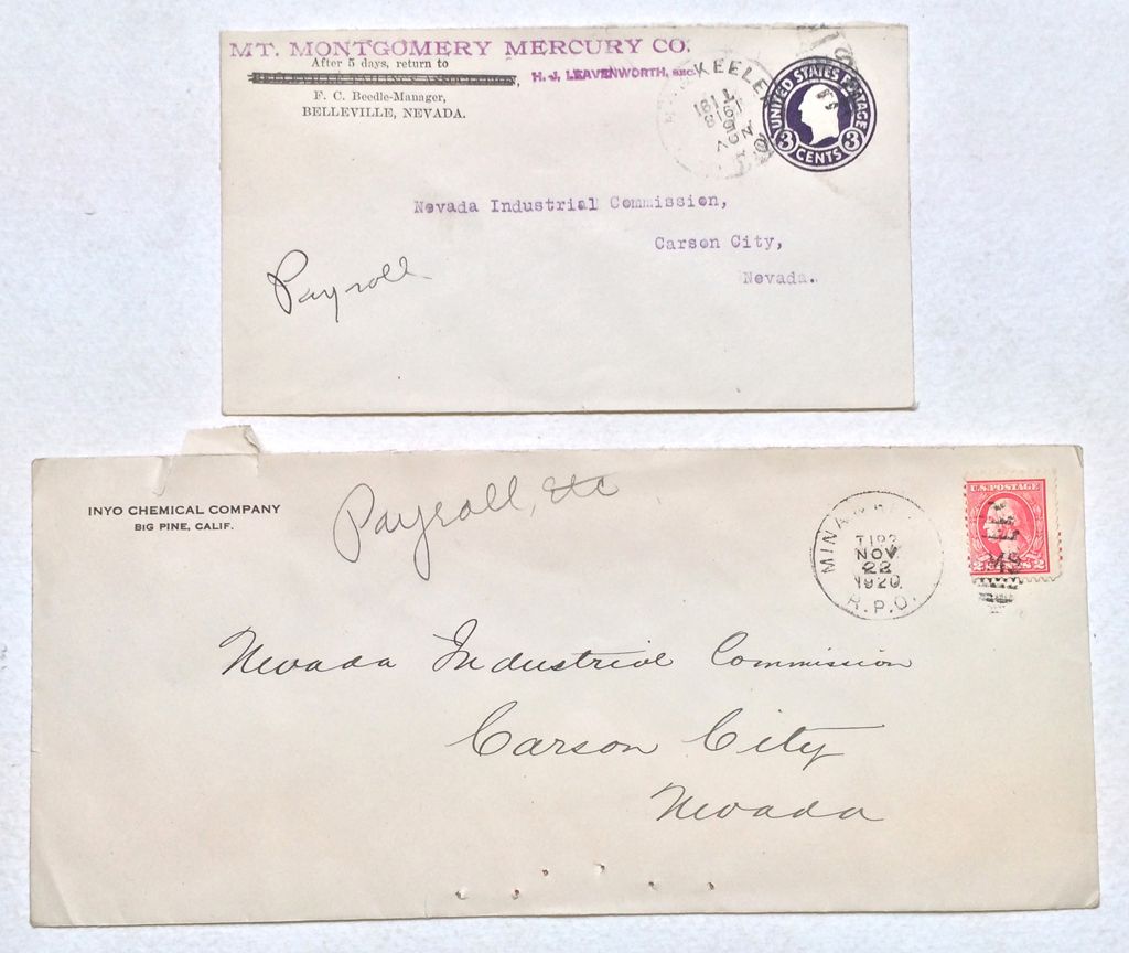 1) Mina & Keeler on envelope mailed from Mt. Montgomery Mercury Company out of Belleville, Nevada. 2) Mina & Keeler (or Mina & Reno) on envelope from the Inyo Chemical Company of Big Pine, California. Two nice pieces