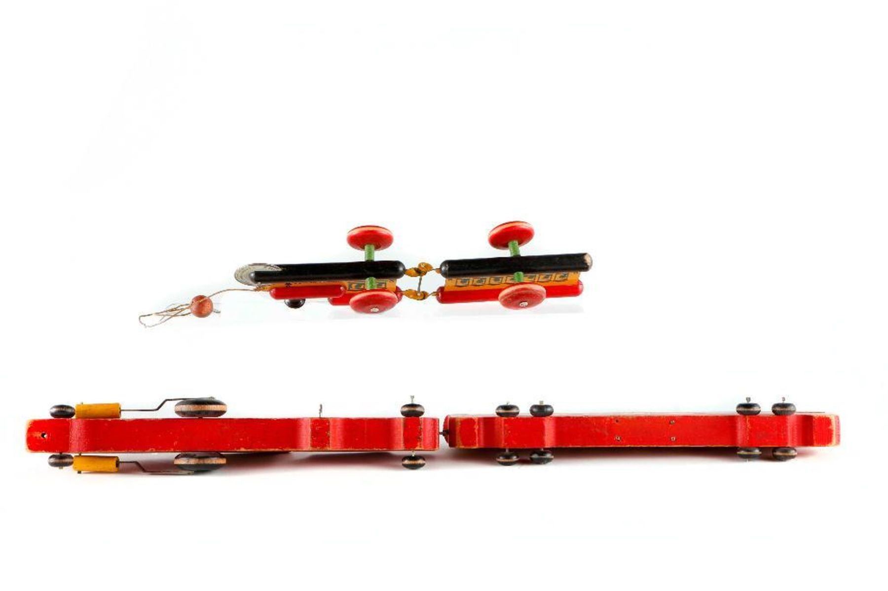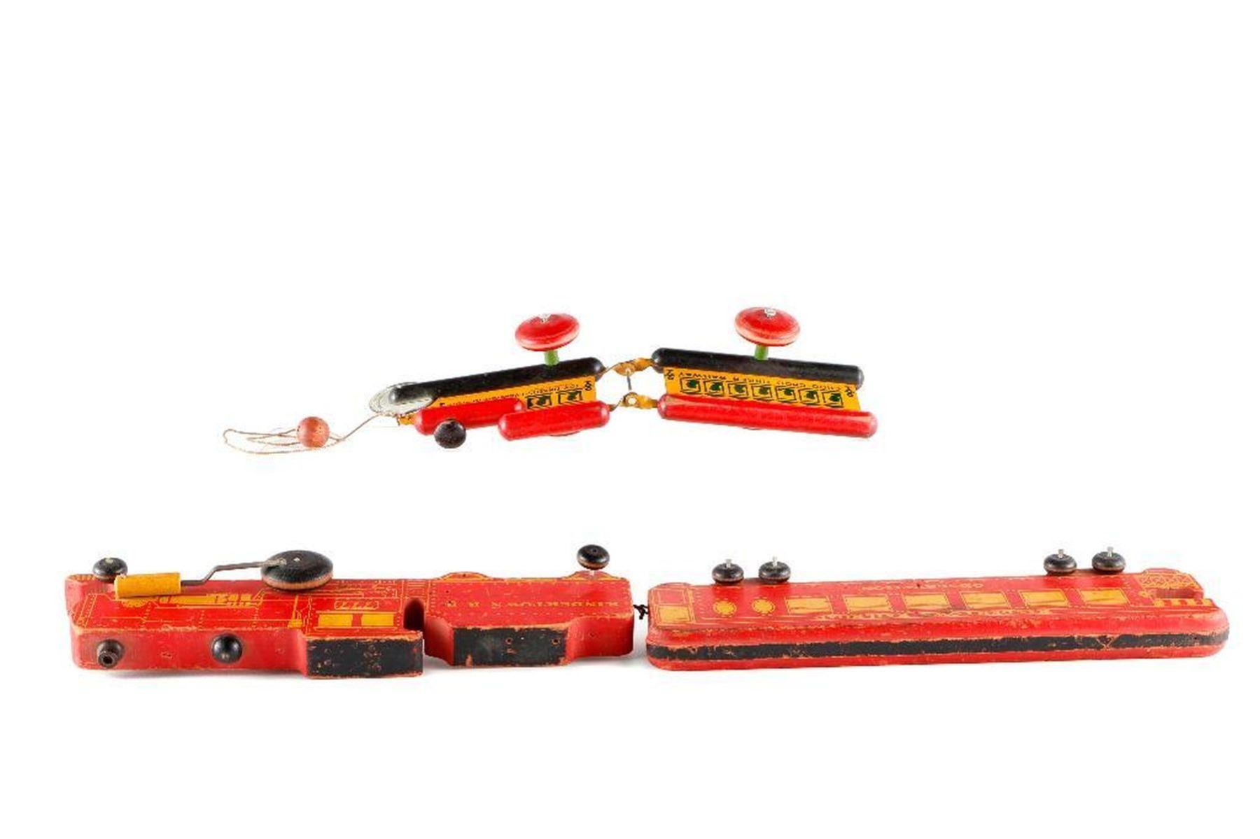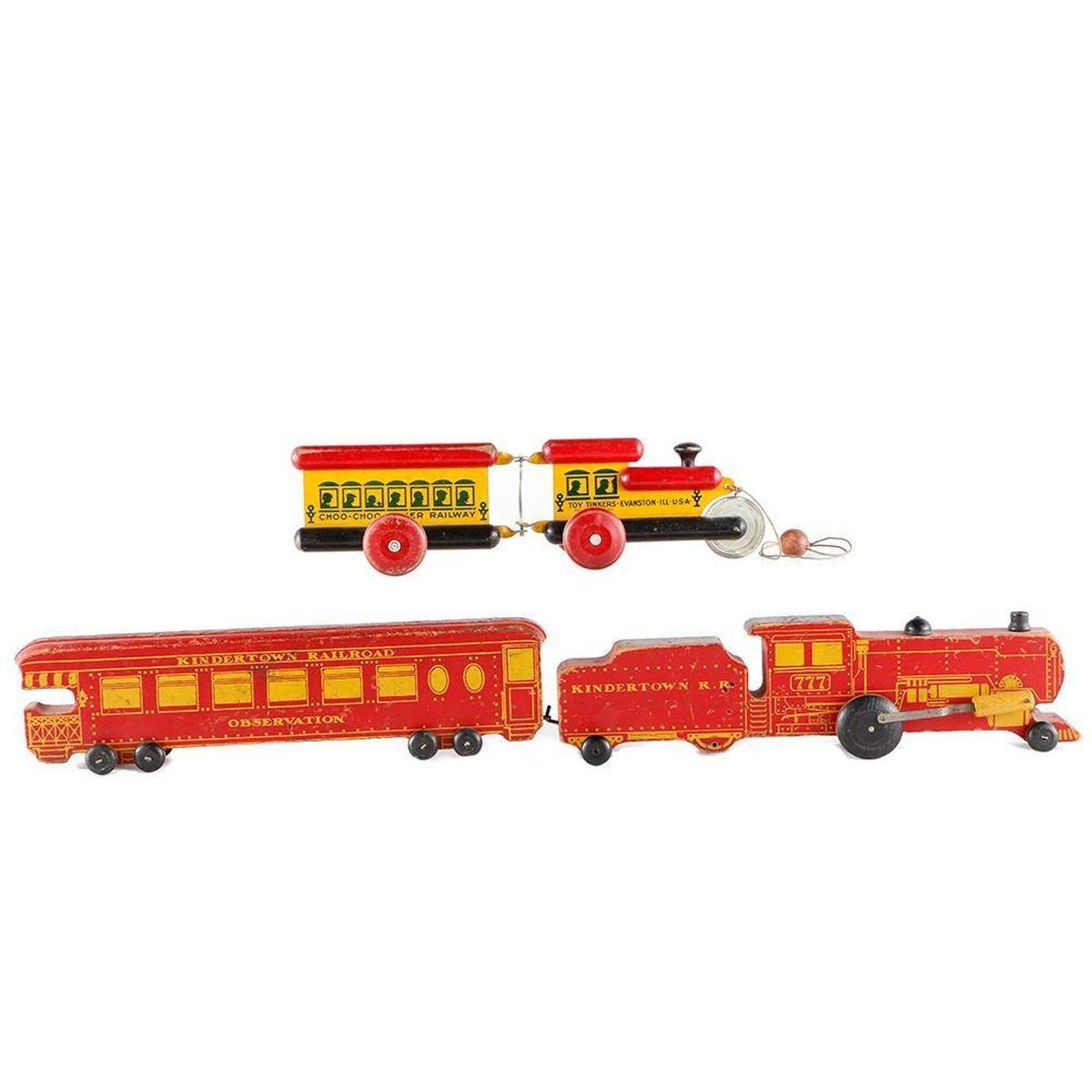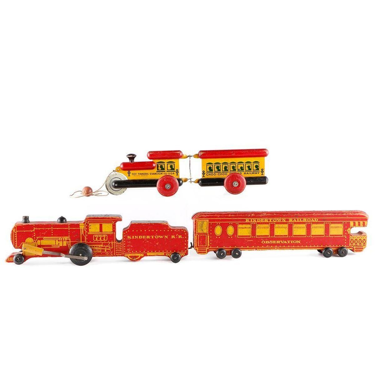 Tinker Railway locomotive and coach, litho steel/wood construction, 14" long; Kinder Toy R/R,locomotive and observation car, litho paper over wood construction, 29" long, C-5/6