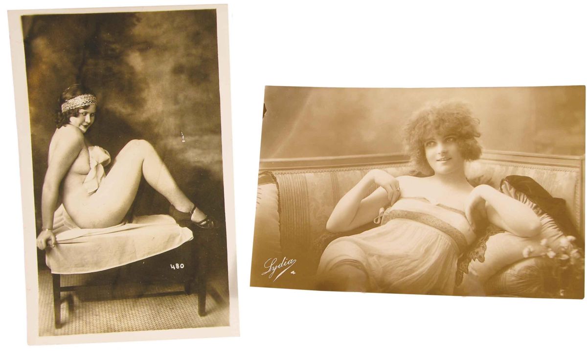Two real photo postcards of Prostitutes, one sitting an one reclining. Excellent condition. 3 1/2 X 5 1/2 inches.