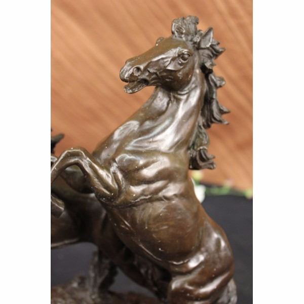 The bronze horse bucks onto its hind legs resisting a force the beholder cannot see. The horse kicks his forelegs into the air as he lets out a authoritative neigh of discontent. It balances upon a
